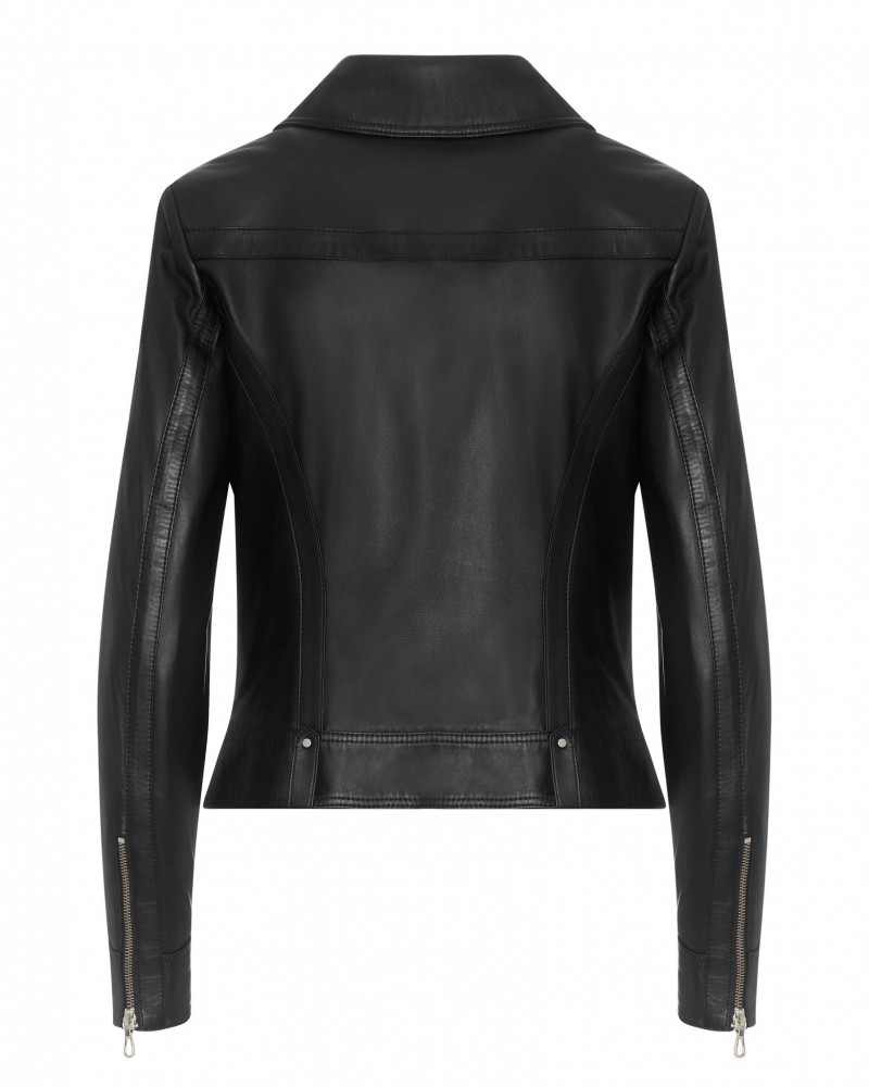 • Przedstawiona na zdjęciu kurtka skórzana jest w kolorze czarnym
