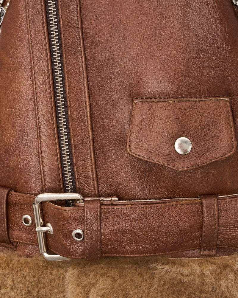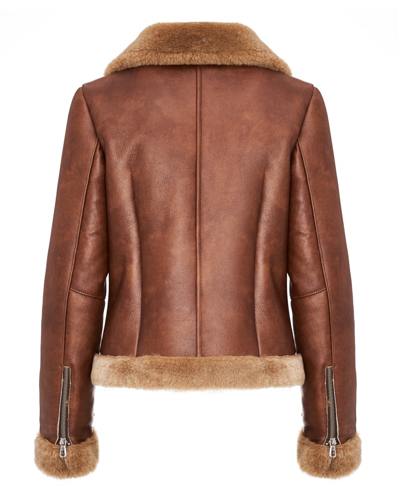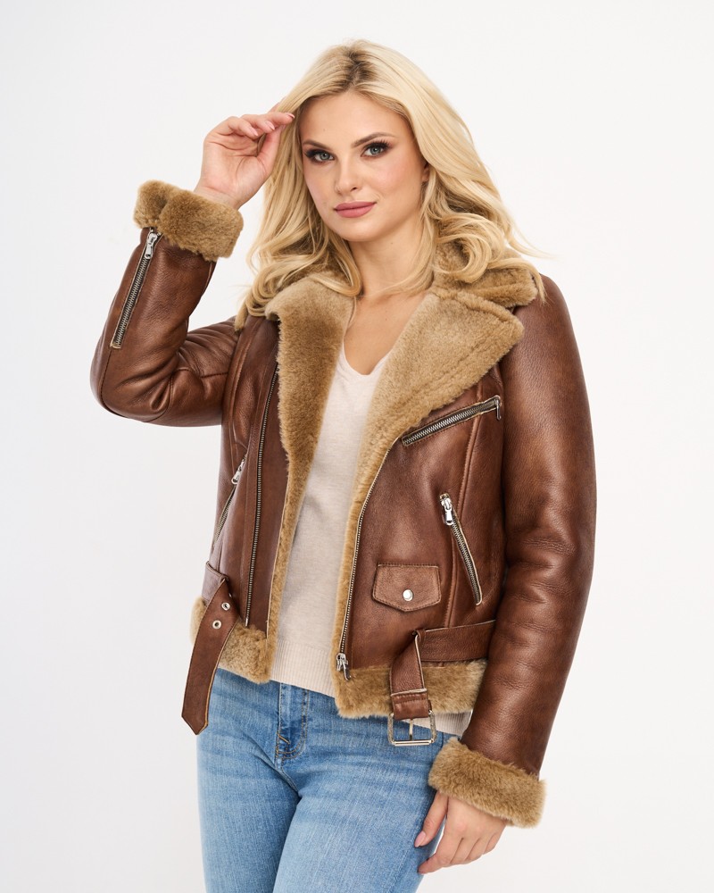 Naturalny kożuch damski Allison z zewnątrz zachwyca miękką, matową warstwą naturalnej skóry owczej, oferującą komfort i znakomity wygląd. U dołu oraz przy mankietach zastosowano ciepłe, odcinające się kolorystycznie od całości futerko znajdujące się także wewnątrz, dzięki czemu projekt zyskał niepowtarzalny charakter. Model kończy się na wysokości bioder, idealnie wpasowując się w krój uwielbianej przez chyba wszystkie kobiety ramoneski.