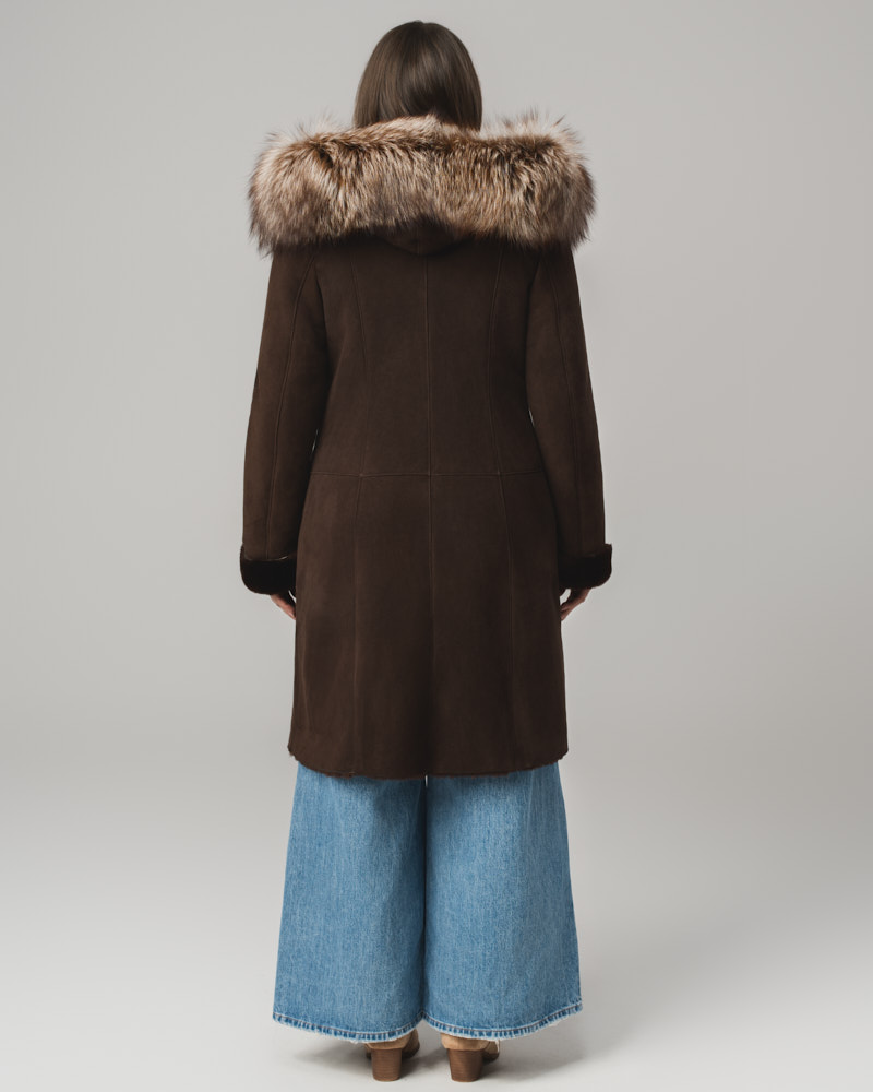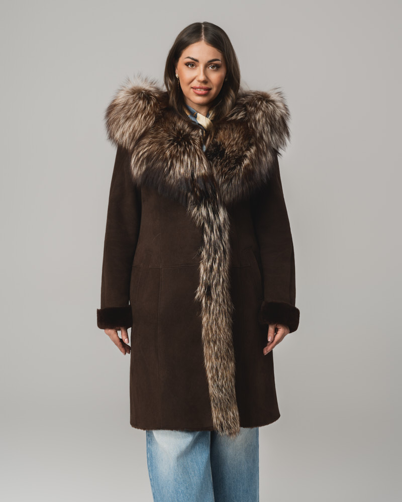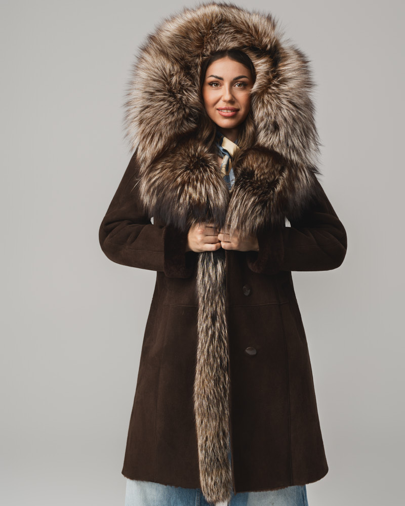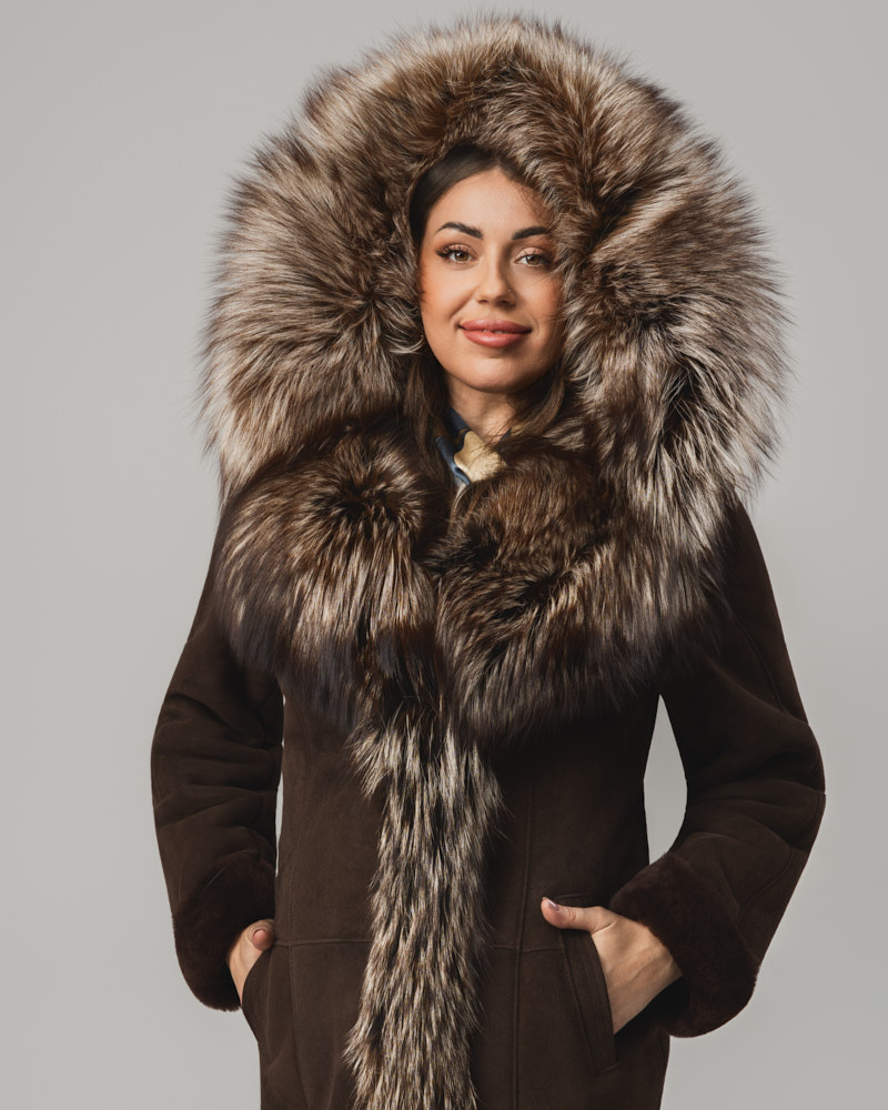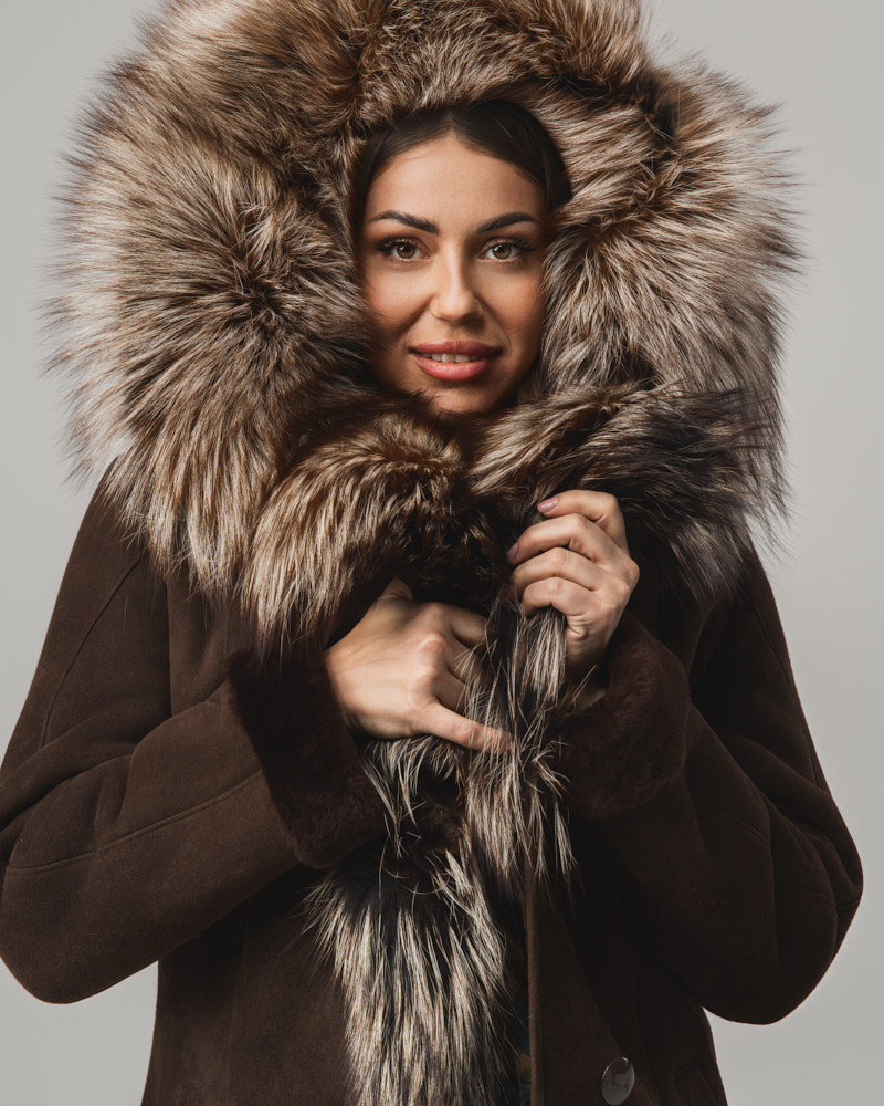 Kożuch damski Edita to długi, sięgający mniej więcej do kolan model, który zadba o komfort termiczny także dolnych partii ciała. Miękka w dotyku, naturalna owcza skóra kożuchowa stanowi gwarancję ciepła i doskonałego samopoczucia nawet podczas najsurowszych mrozów. Co więcej, materiał ten prezentuje się niezwykle stylowo i jest wyjątkowo trwały, dlatego przez lata prezentować się będzie nienagannie. Kaptur, kołnierz, mankiety rękawów oraz brzegi kurtki zostały obszyte naturalnym jenotem, który nadaje luksusowego wyglądu całemu projektowi oraz zachęca do wtulenia się w zachwycająco miękkie w dotyku futerko.
