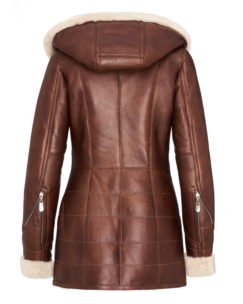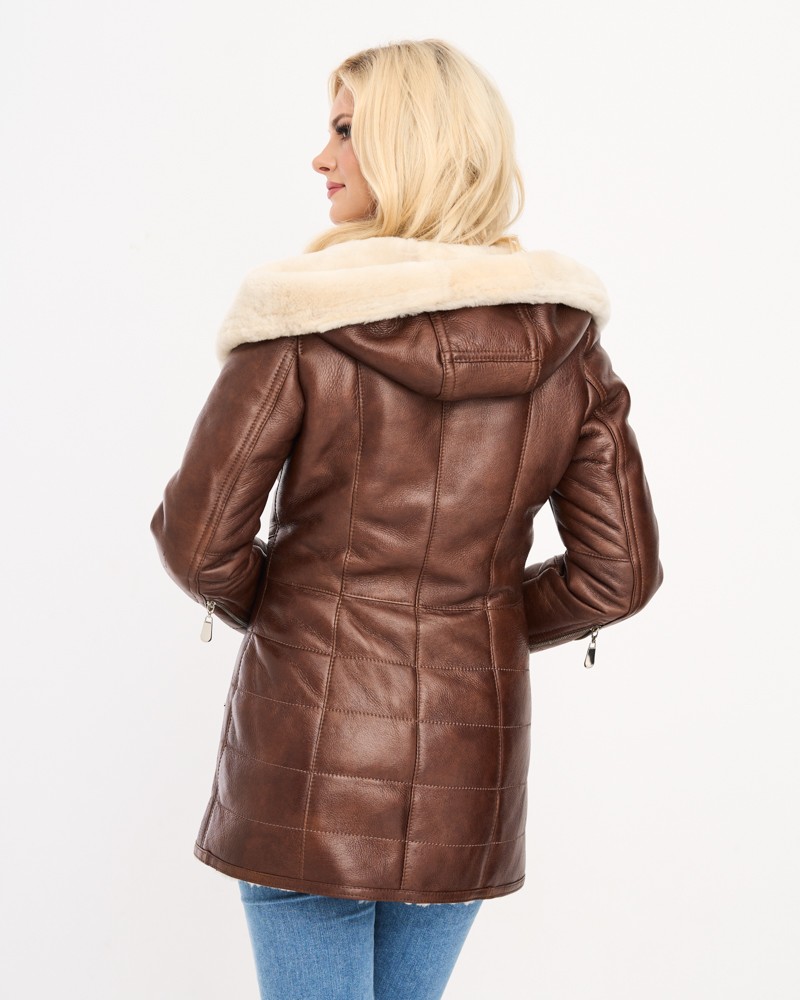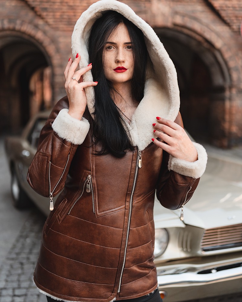Naturalny damski kożuch Elena intrygujący design zawdzięcza wykorzystaniu do produkcji wytrzymałej, odpornej na uszkodzenia skóry owczej. Zewnętrzną warstwę stanowi gładka, matowa skóra, ozdobiona atrakcyjnymi przeszyciami. Przy mankietach rękawów, wykładanym kołnierzu oraz kapturze znajduje się natomiast miękkie, odcinające się kolorystycznie od całości futerko, takie samo, jakie wyściela spód modelu. Dzięki temu kożuch zyskał niepowtarzalny, przyciągający uwagę, modny wygląd.