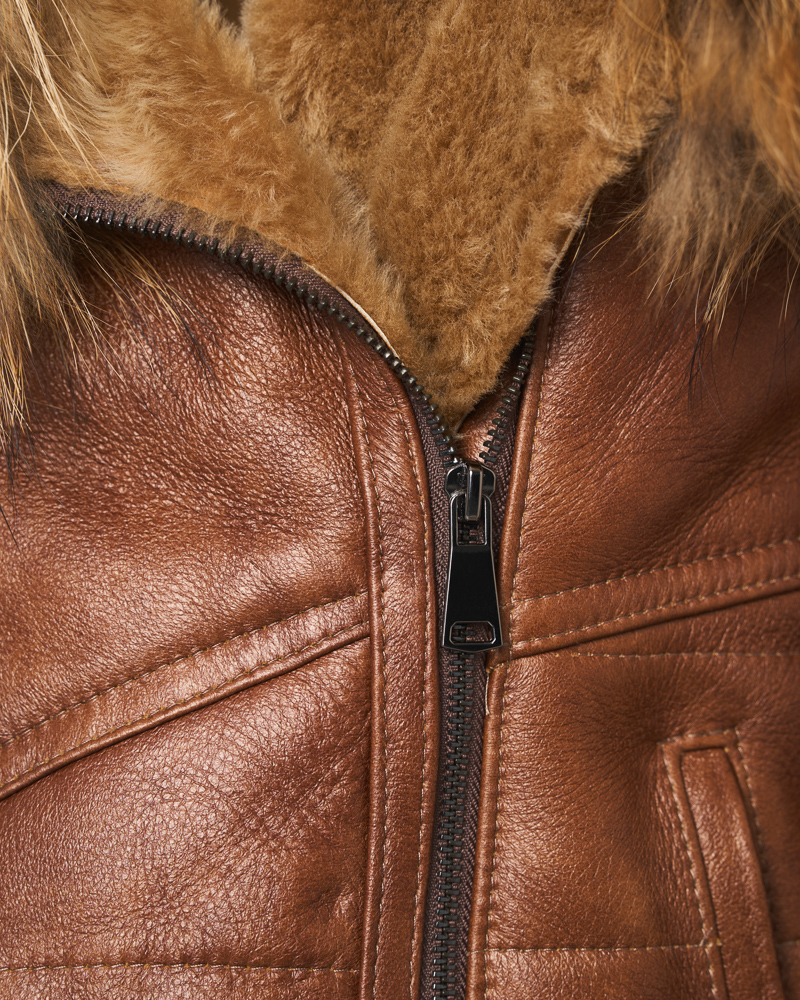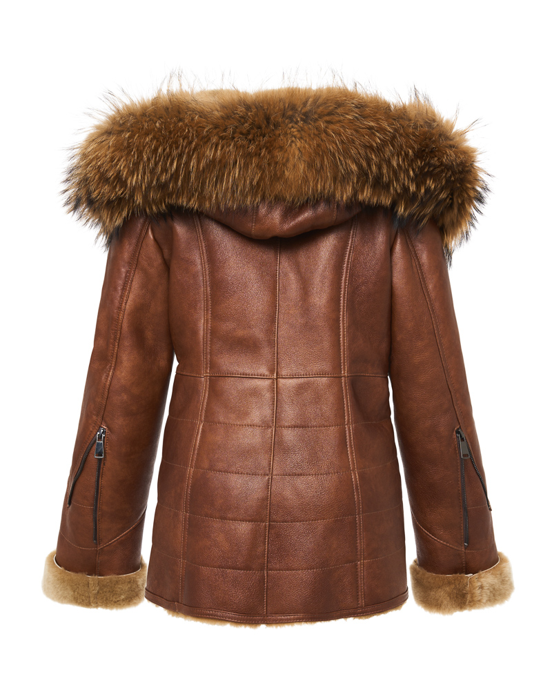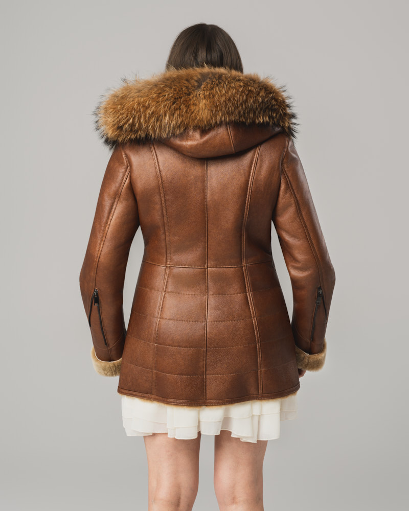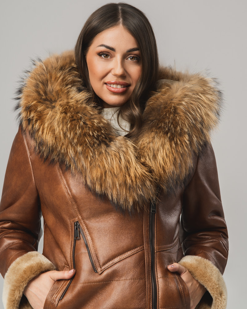 Kożuch damski Elena wyróżniają starannie poprowadzone przeszycia, które subtelnie modelują sylwetkę, nadając jej lekkości i proporcji. Asymetryczny zamek błyskawiczny, ozdobne zamki przy rękawach oraz lekko zaokrąglony dół dodają nowoczesności i charakteru, zachowując przy tym kobiecą elegancję. Miękkie futro widoczne przy mankietach i spodzie podkreśla naturalne pochodzenie materiału oraz dbałość o każdy detal.