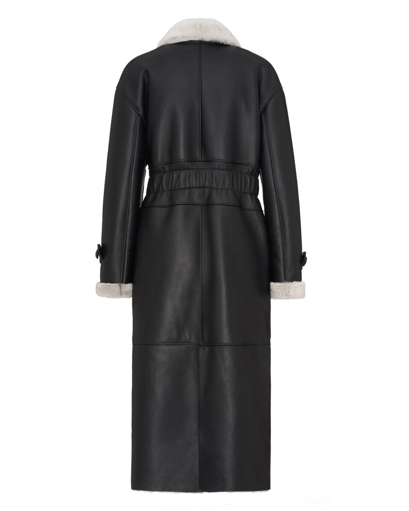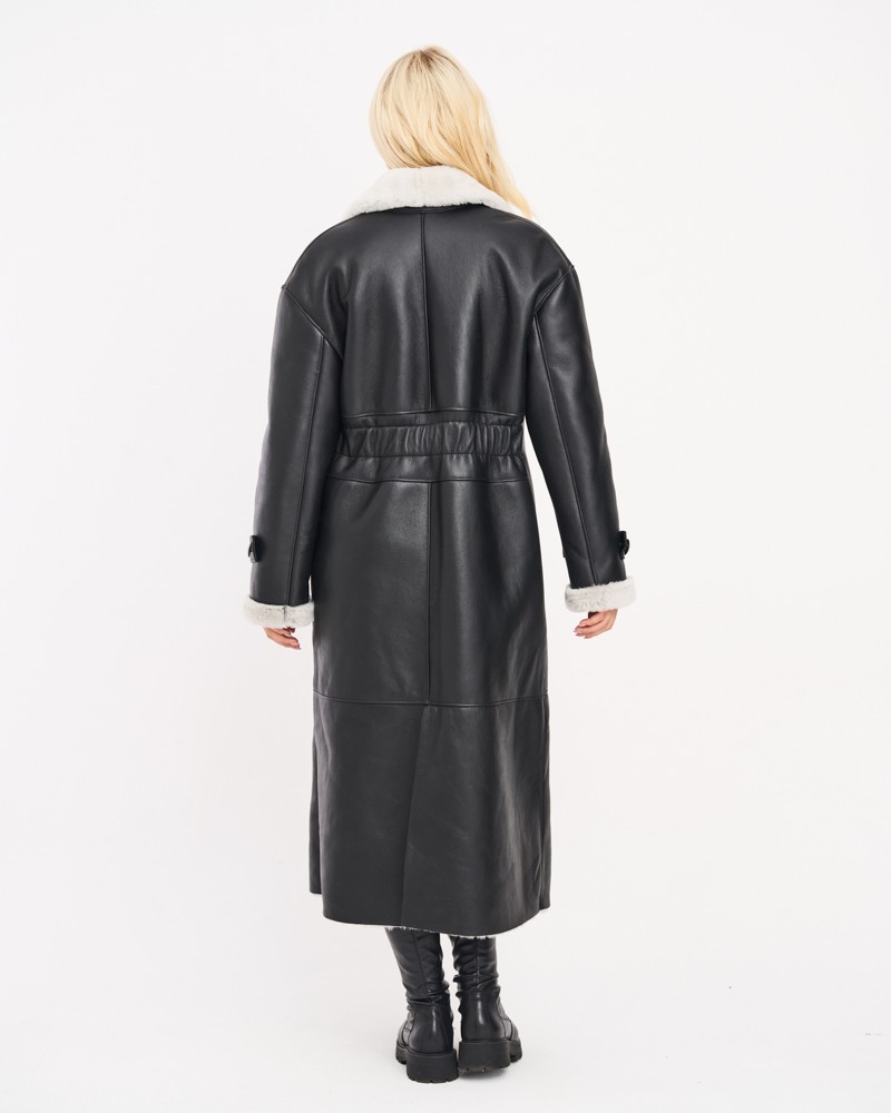 Naturalny kożuch damski Everly posiada zapięcie w formie dwurzędowych guzików kolorystycznie konweniujących z całością projektu. Stonowany design ożywiają wstawki z miłego w dotyku, naturalnego futerka, biegnące wzdłuż krawędzi modelu na całej jego długości, a także obecne przy mankietach rękawów i kołnierzu. Z tyłu u dołu znajduje się rozcięcie zwiększające swobodę ruchów, a po bokach praktyczne kieszenie. Całość dopełniają klamerki przy rękawach zapinane na eleganckie guziki.