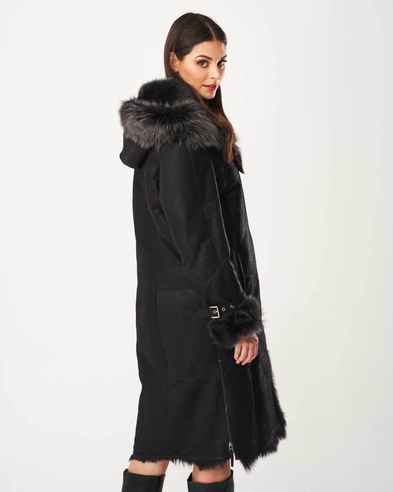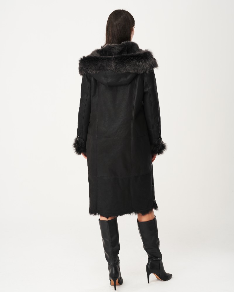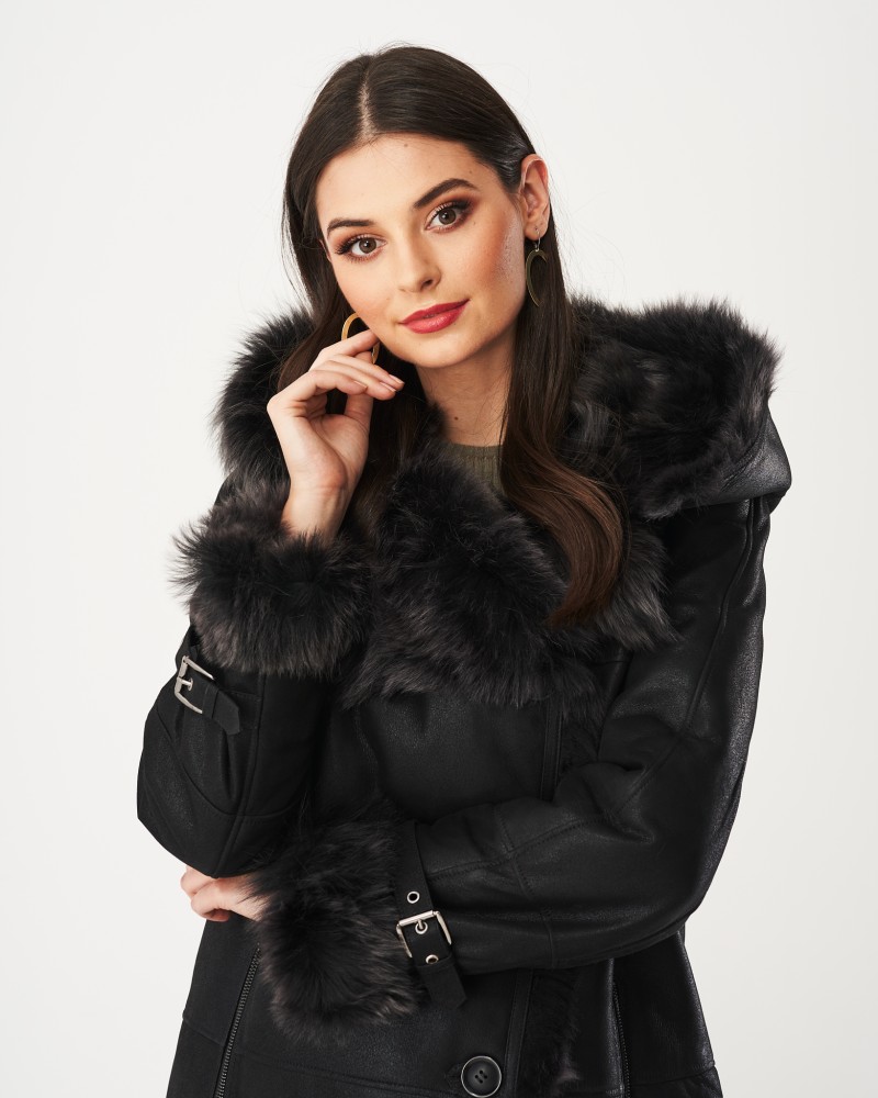 Kożuch damski Gabriella to projekt, w którym szczególną uwagę zwróciliśmy na detale. Obszerny kaptur, zapewniający jeszcze większą ochronę przed deszczem, śniegiem i wiatrem, obszyty został przyjemnym w dotyku, naturalnym lisem. Podobny zabieg zastosowaliśmy przy rękawach, które dodatkowo wzbogaciliśmy efektownie się prezentującym zapięciem na klamry, pozwalającym na swobodną regulację obwodu rękawa. Cały kożuch uszyliśmy z naturalnej skóry owczej, słynącej ze swojej wytrzymałości oraz odporności na działanie mrozu lub śniegu, pod wpływem których nigdy nie moknie i nie niszczeje, gwarantując przy tym skórze swobodne oddychanie.