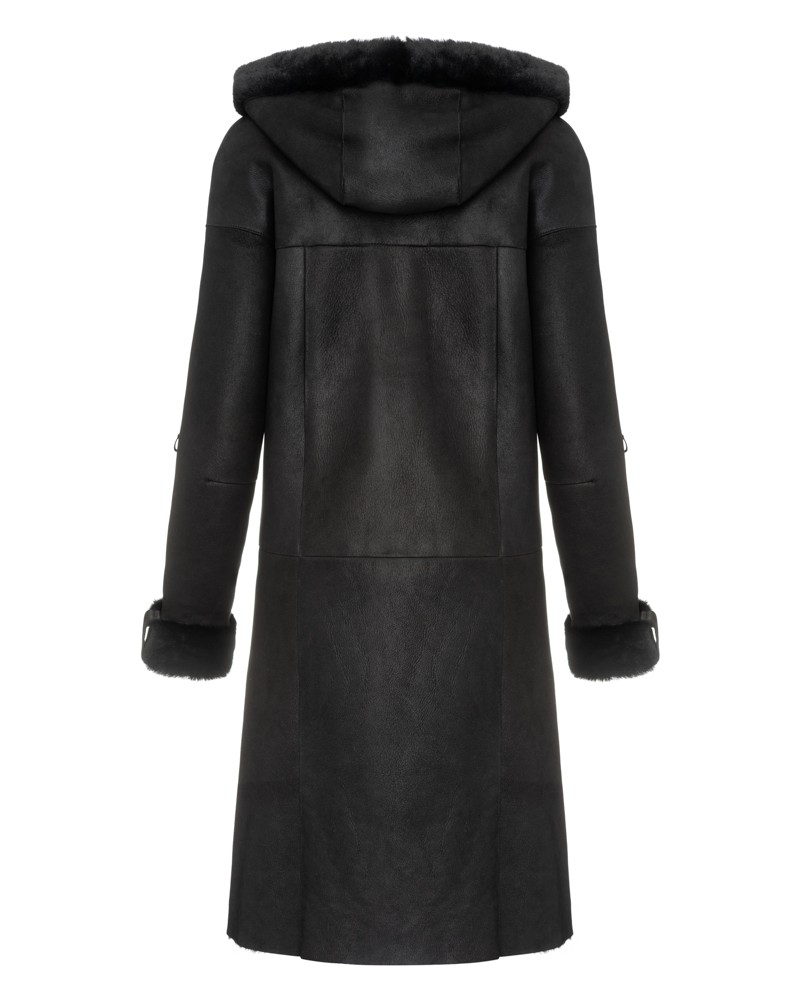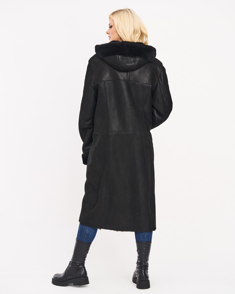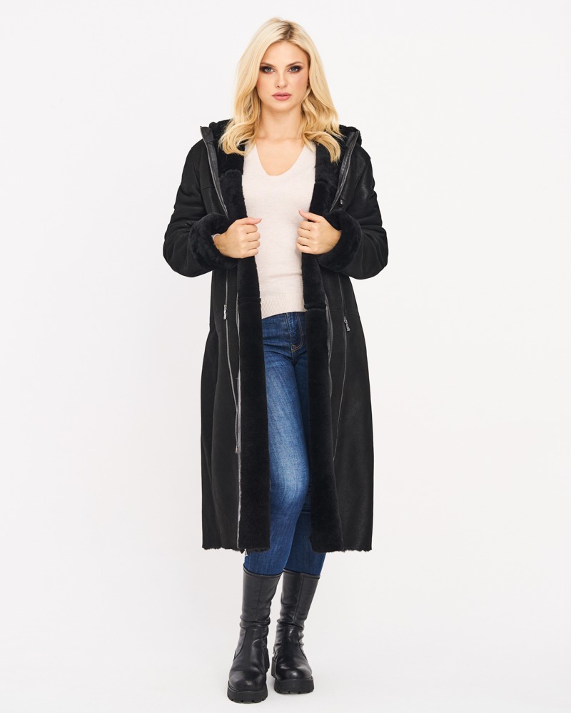 Kożuch damski Greta posiada prosty krój oraz długość przed kolano, dlatego doskonale układa się na każdym typie sylwetki. Model zapinany jest na wytrzymały, dwustronny zamek błyskawiczny, który znajduje się również przy funkcjonalnych kieszeniach i po bokach kożucha, umożliwiając swobodną regulację obwodu i dopasowanie go do swojej figury. Kożuch wyposażyliśmy też w ciepły kaptur z praktycznymi trokami rozkładający się na elegancki kołnierz oraz urocze, futerkowe mankiety obecne przy rękawach.