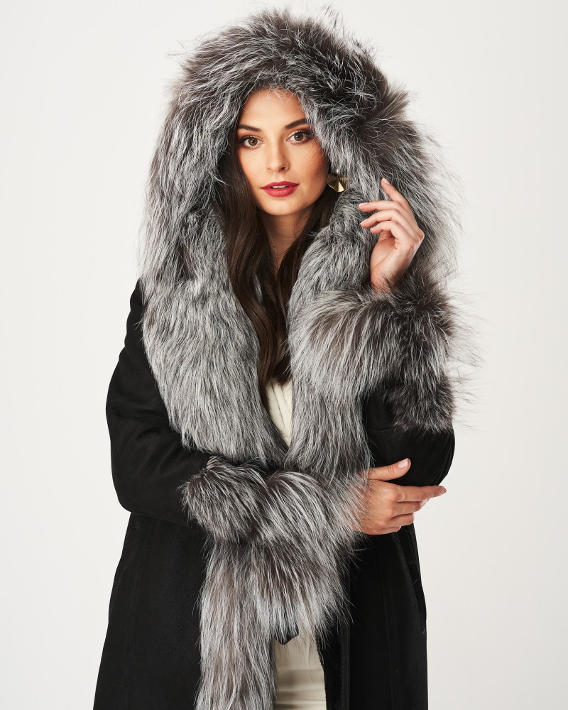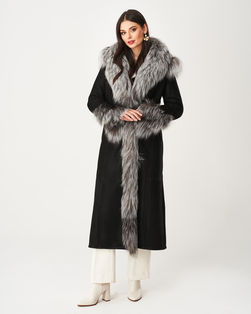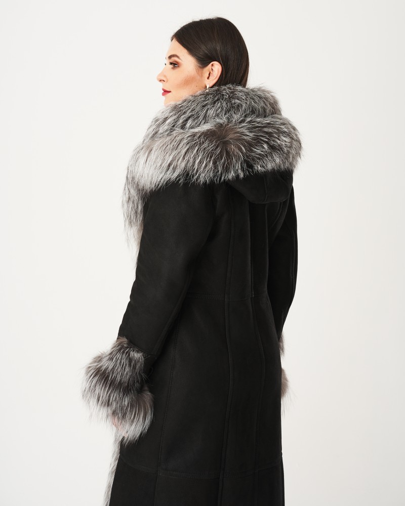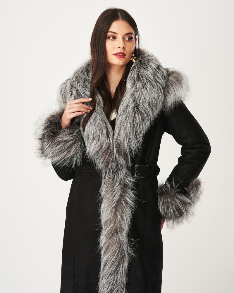 Kożuch damski Karen posiada prosty, ponadczasowy fason oraz wygodne zapięcie na solidnie przyszyte guziki. W talii znajduje się pasek z elegancką klamrą, którym doskonale podkreślisz figurę. Podobne klamry zastosowano przy rękawach, dzięki czemu będziesz mogła swobodnie regulować ich obwód. Serce projektu stanowią wstawki ze srebrnego lisa, obecne przy rękawach oraz obszernym, doskonale chroniącym przed niepogodą kapturze, z którego miłe, miękkie w dotyku futerko spływa wzdłuż jednej poły niemal do samej ziemi. Tego typu dodatki sprawiają, że model prezentuje się wyjątkowo elegancko, pozwalając Ci poczuć się jak gwiazda filmowa.