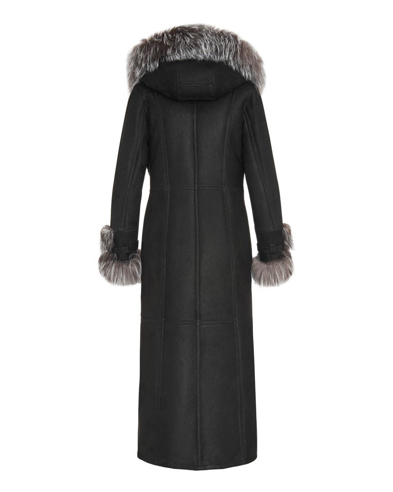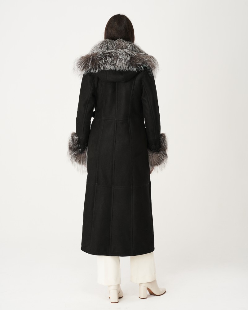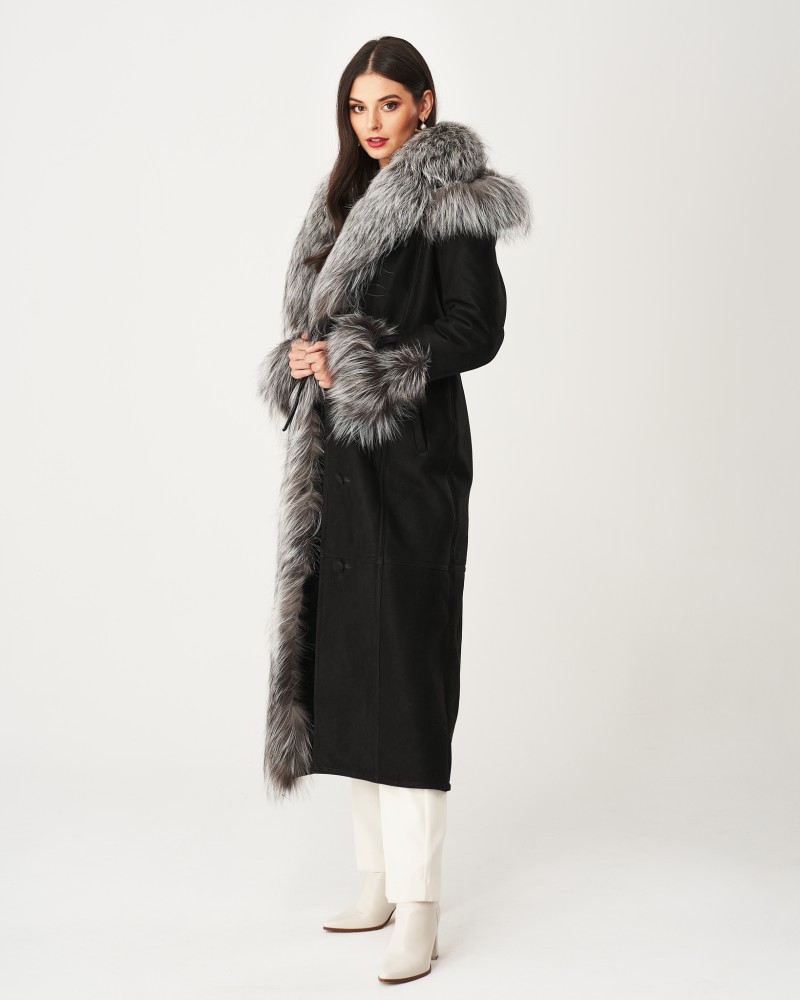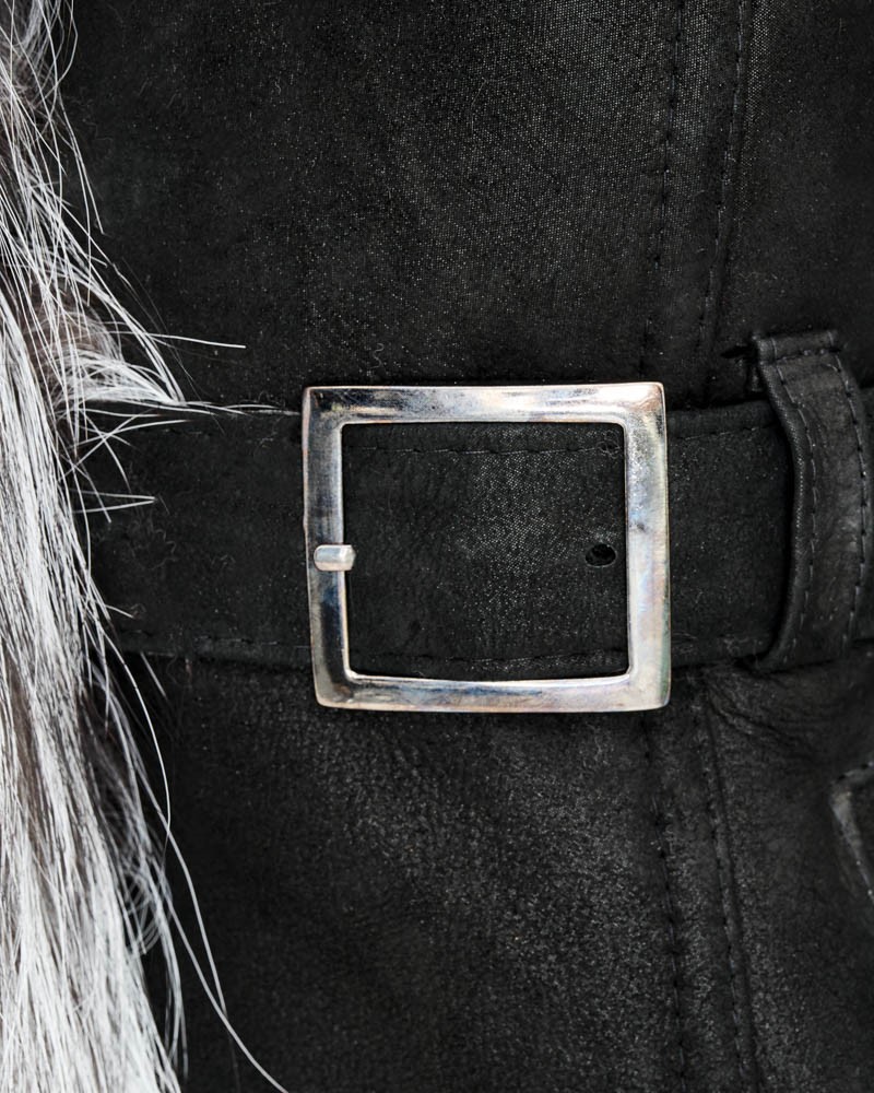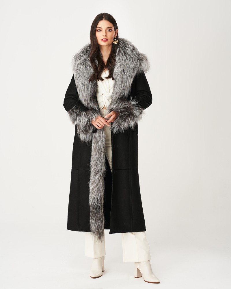 Kożuch damski Karen posiada prosty, ponadczasowy fason oraz wygodne zapięcie na solidnie przyszyte guziki. W talii znajduje się pasek z elegancką klamrą, którym doskonale podkreślisz figurę. Podobne klamry zastosowano przy rękawach, dzięki czemu będziesz mogła swobodnie regulować ich obwód. Serce projektu stanowią wstawki ze srebrnego lisa, obecne przy rękawach oraz obszernym, doskonale chroniącym przed niepogodą kapturze, z którego miłe, miękkie w dotyku futerko spływa wzdłuż jednej poły niemal do samej ziemi. Tego typu dodatki sprawiają, że model prezentuje się wyjątkowo elegancko, pozwalając Ci poczuć się jak gwiazda filmowa.