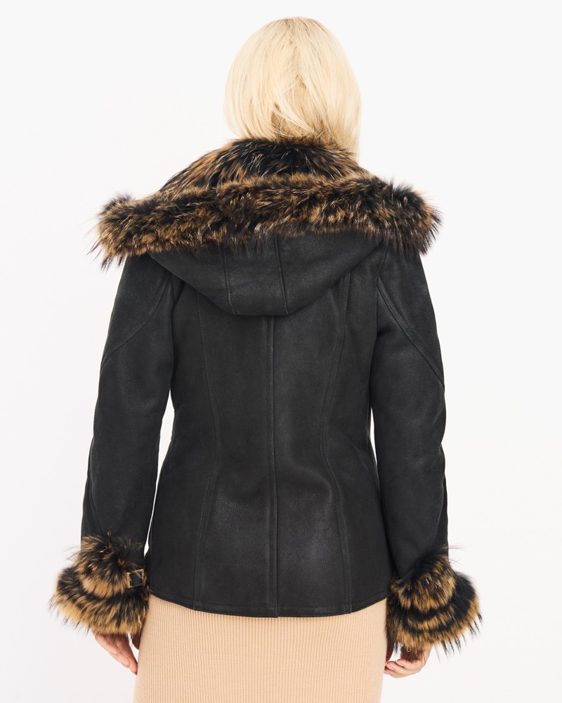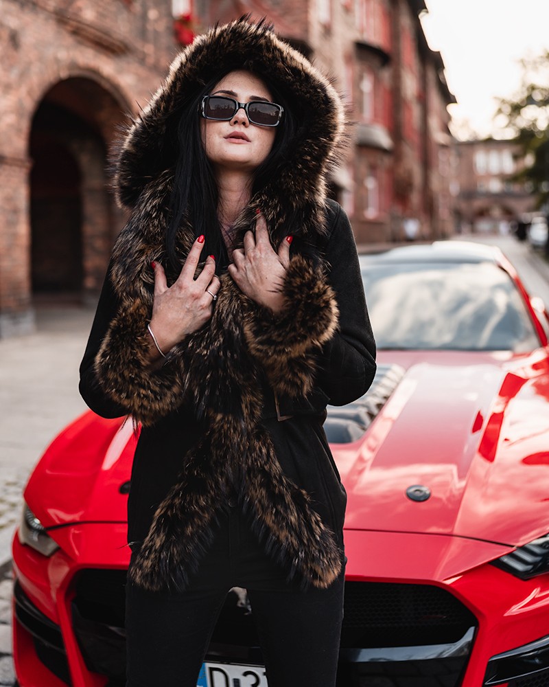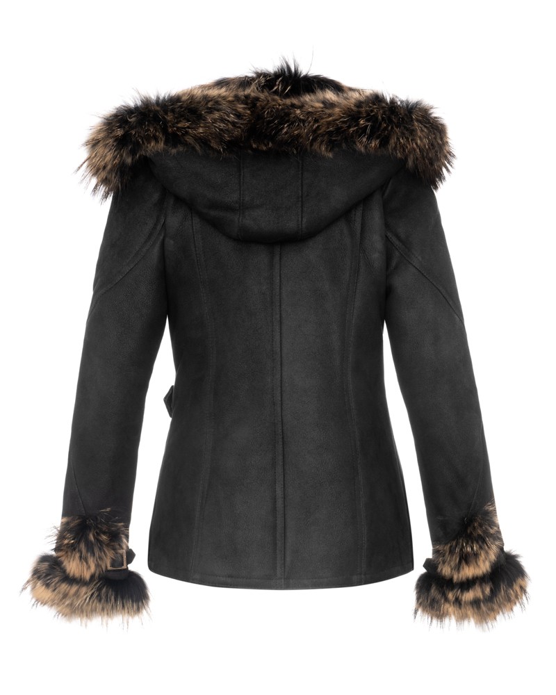 Kożuch damski Laura wykonano z naturalnej skóry owczej, która dobrze przylega do ciała, a jednocześnie gwarantuje dużą swobodę ruchów. Odpinany kaptur tworzy piękny, szalowy kołnierz, który jest tym bardziej wyjątkowy, że obszyty został – podobnie jak mankiety rękawów – naturalnym jenotem, co daje spektakularny efekt wizualny i wyróżnia model w tłumie klasą oraz elegancją. Kożuch sięga do bioder, dzięki czemu delikatnie podkreśla ich krągłości oraz znakomicie komponuje się zarówno z jeansami, jak i dopasowanymi, skórzanymi spodniami.