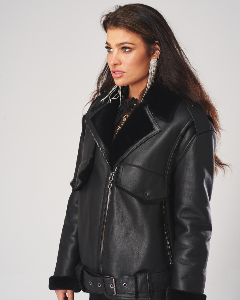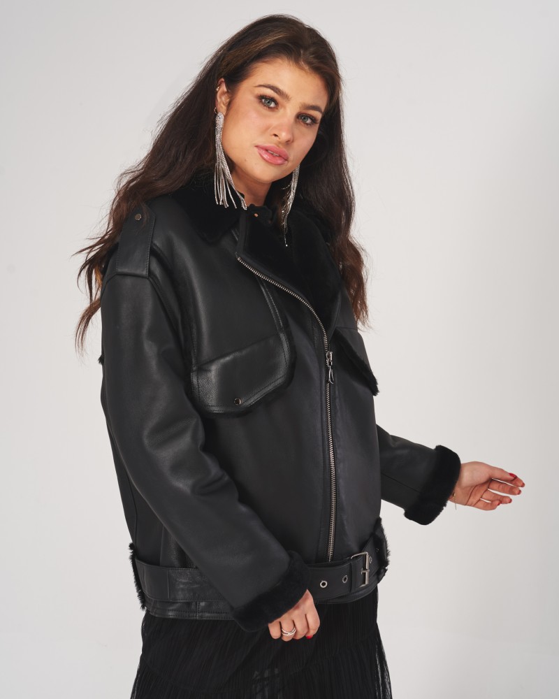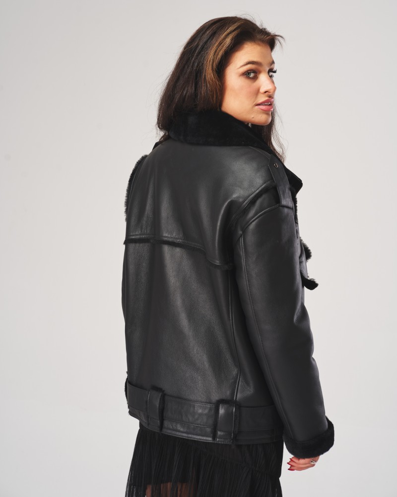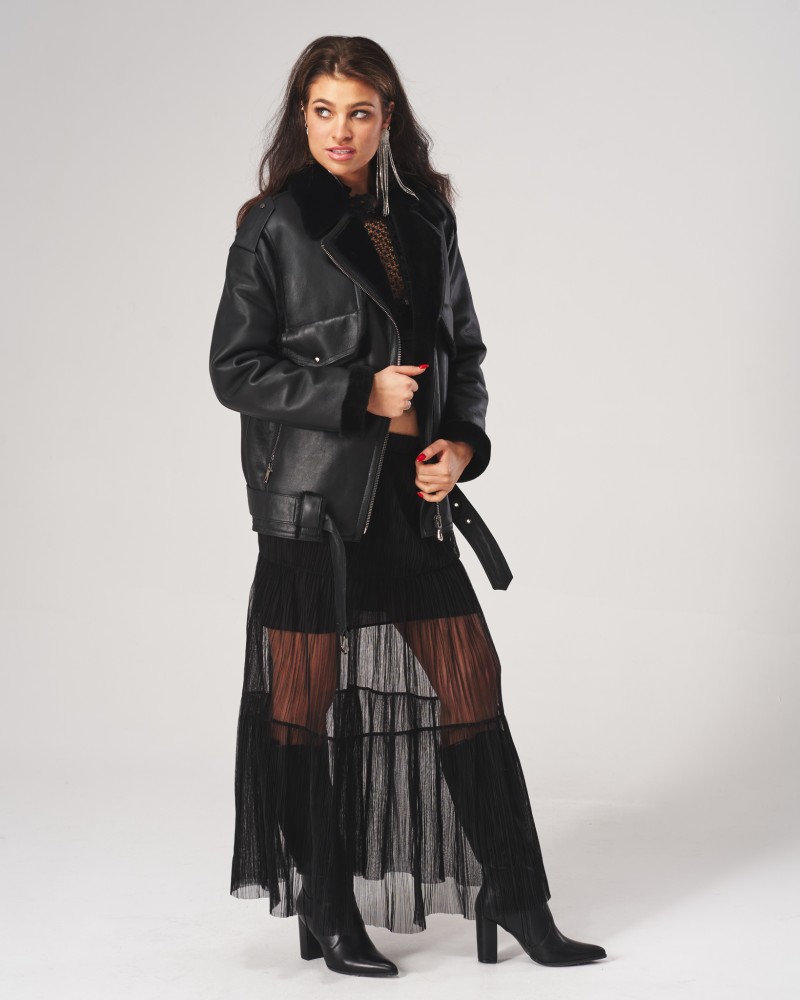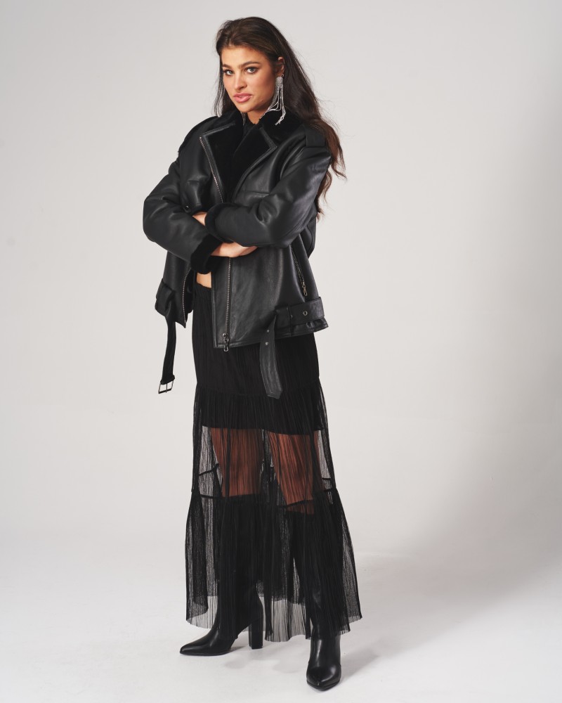 Kożuch damski Liza to wyjątkowy model utrzymany w klasycznej, ciemnej palecie barw, dlatego idealnie wpasuje się w różnorodne zimowe stylizacje. Zaprojektowany w ponadczasowym, obszernym fasonie typu oversize, oferuje niezrównany komfort, wygodę oraz swobodę ruchów, umożliwiając jednocześnie noszenie dodatkowych warstw ubrań pod spodem podczas najzimniejszych dni roku. Na dole umieszczono pas z klamrą w kolorze harmonizującym z resztą projektu, który pozwala na regulację obwodu kożucha dla jego lepszego dopasowania do figury i podkreślenia jej kształtów.