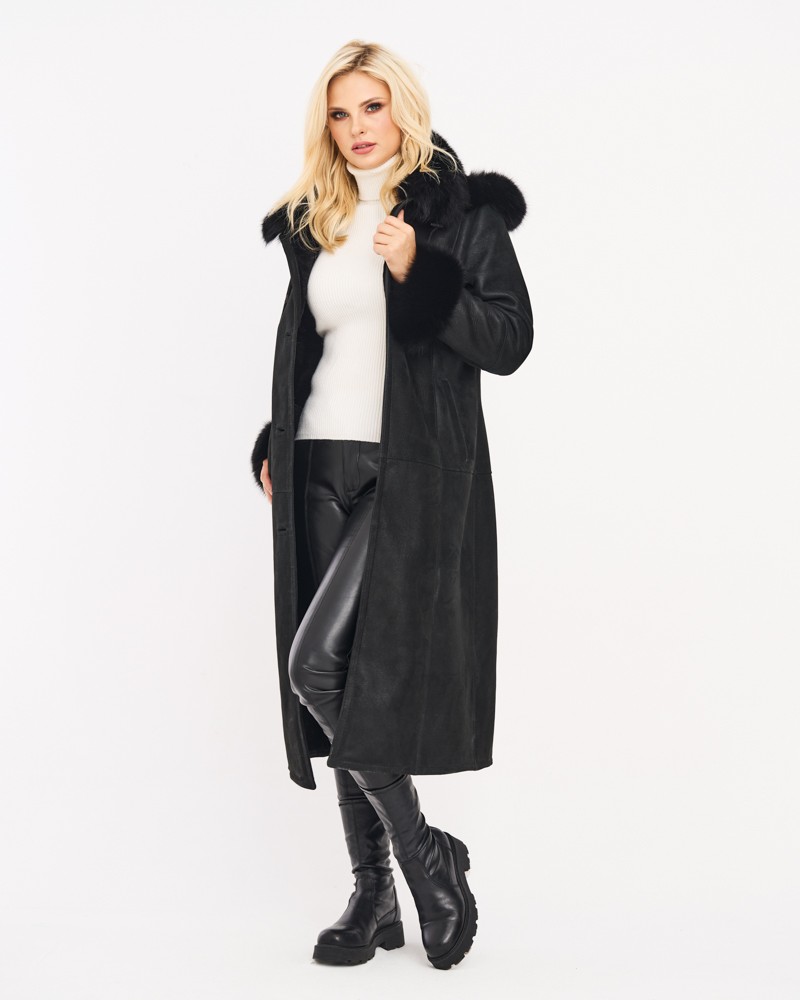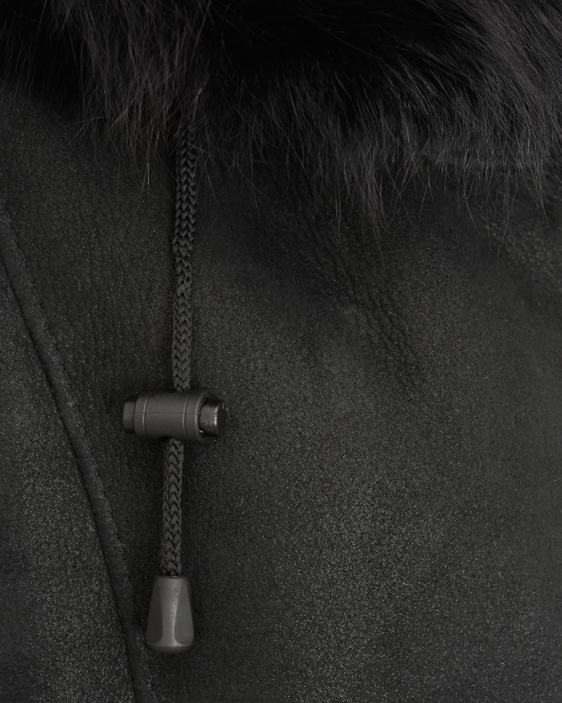 Naturalny damski kożuch Magda czarny posiada prosty, niezwykle komfortowy fason długością sięgający za kolano. Dzięki temu model doskonale prezentuje się na każdym typie sylwetki, optycznie ją wysmuklając i chroniąc wrażliwe partie ciała przed zimnem. Ciepły, wyposażony w troki umożliwiające regulację kaptur obszyto – podobnie jak mankiety rękawów i kołnierz – naturalnym lisem, kolorystycznie delikatnie odcinającym się od całości i nadającym projektowi niepowtarzalnego charakteru.