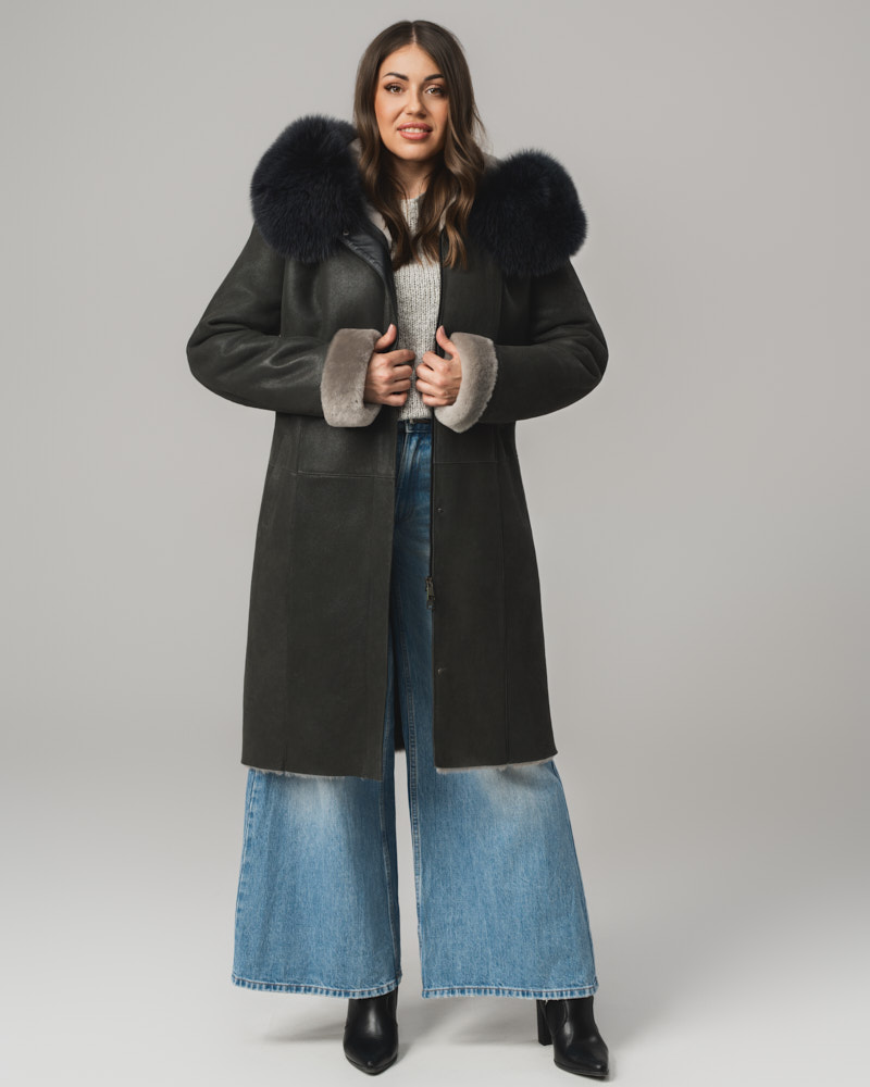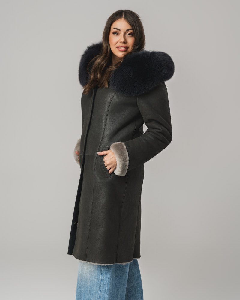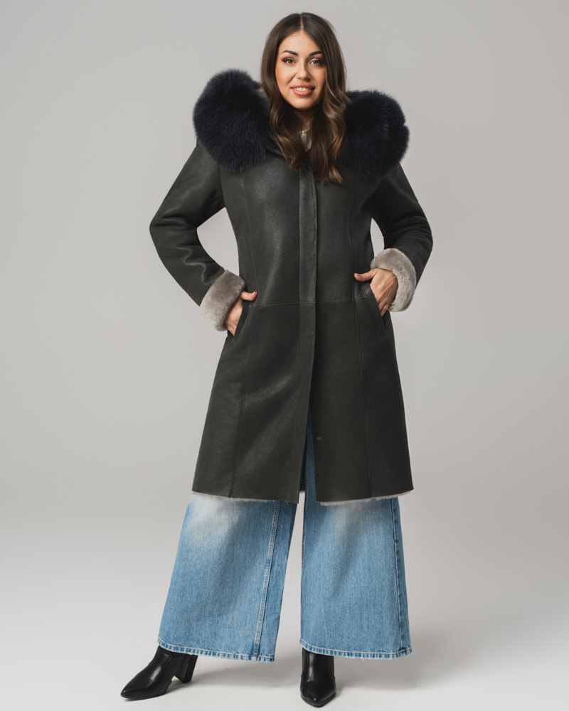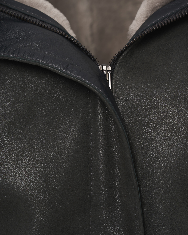 Kożuch damski Maja posiada listwę na zatrzaski, pod którą ukryty jest praktyczny zamek dzięki temu kożuch zachowuje minimalistyczny wygląd, a jednocześnie doskonale zabezpiecza przed zimnem. Delikatne przeszycia i mankiety z widocznym futerkiem podkreślają precyzję wykonania i naturalne piękno materiału.