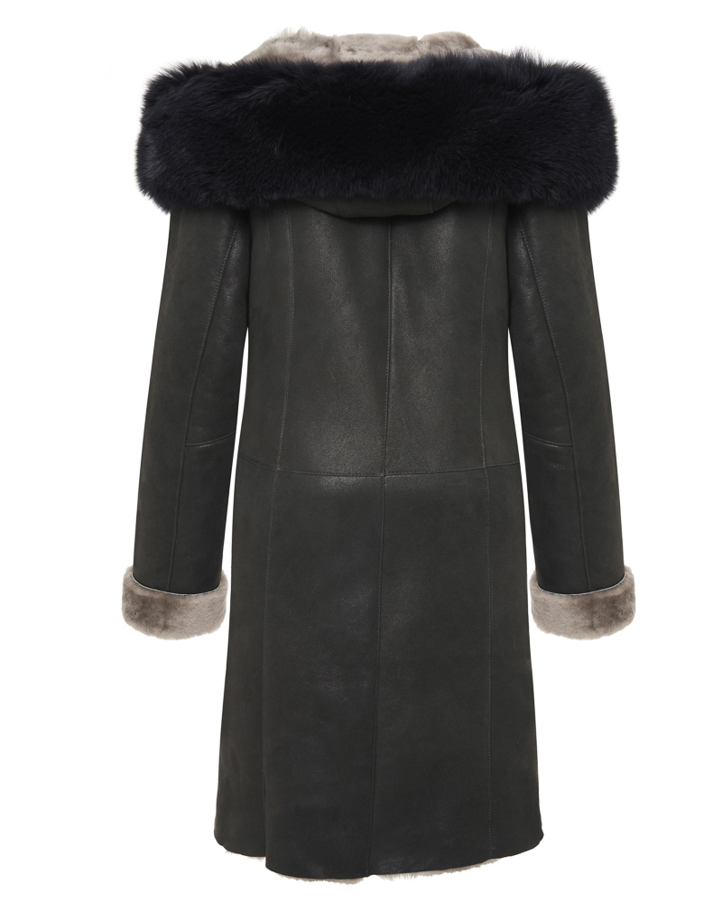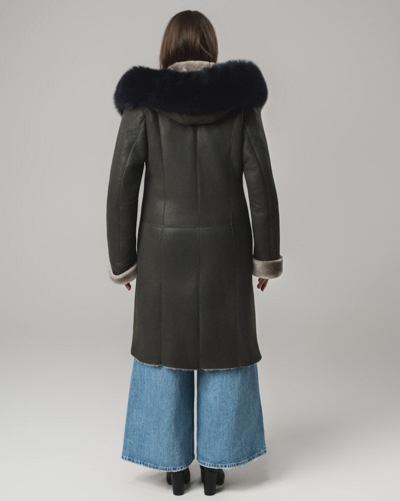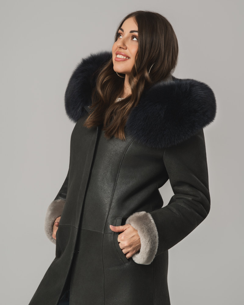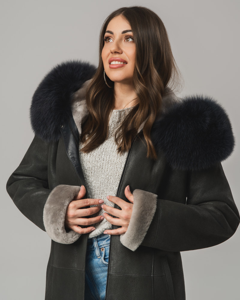 Kożuch damski Maja posiada listwę na zatrzaski, pod którą ukryty jest praktyczny zamek dzięki temu kożuch zachowuje minimalistyczny wygląd, a jednocześnie doskonale zabezpiecza przed zimnem. Delikatne przeszycia i mankiety z widocznym futerkiem podkreślają precyzję wykonania i naturalne piękno materiału.