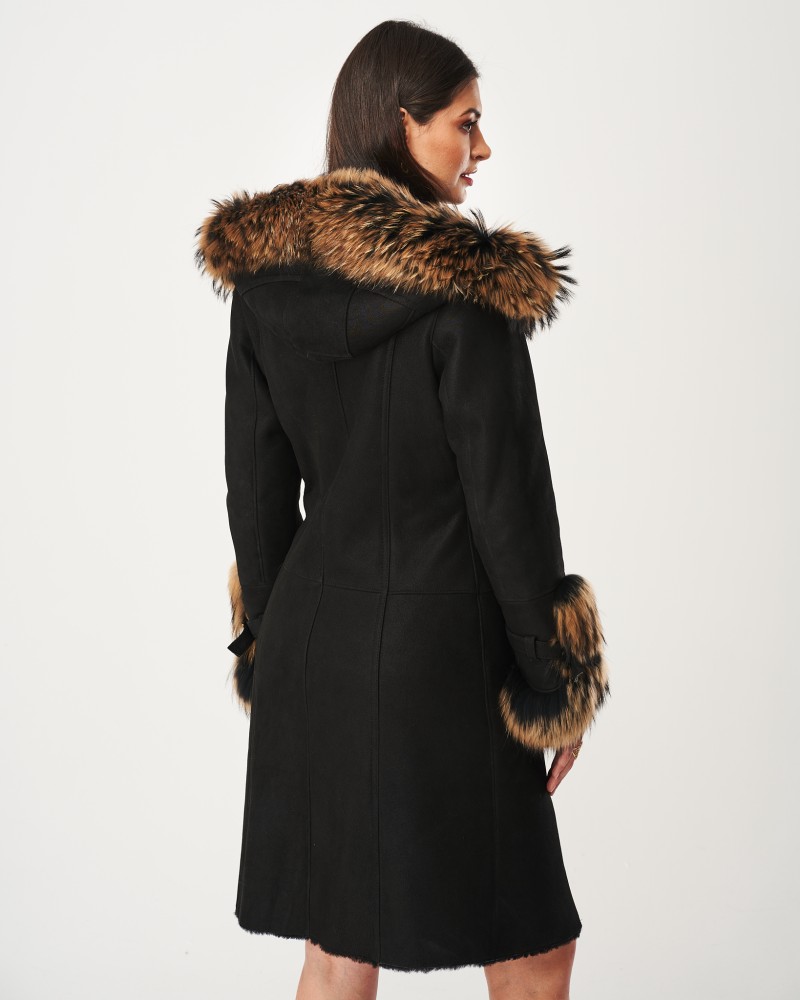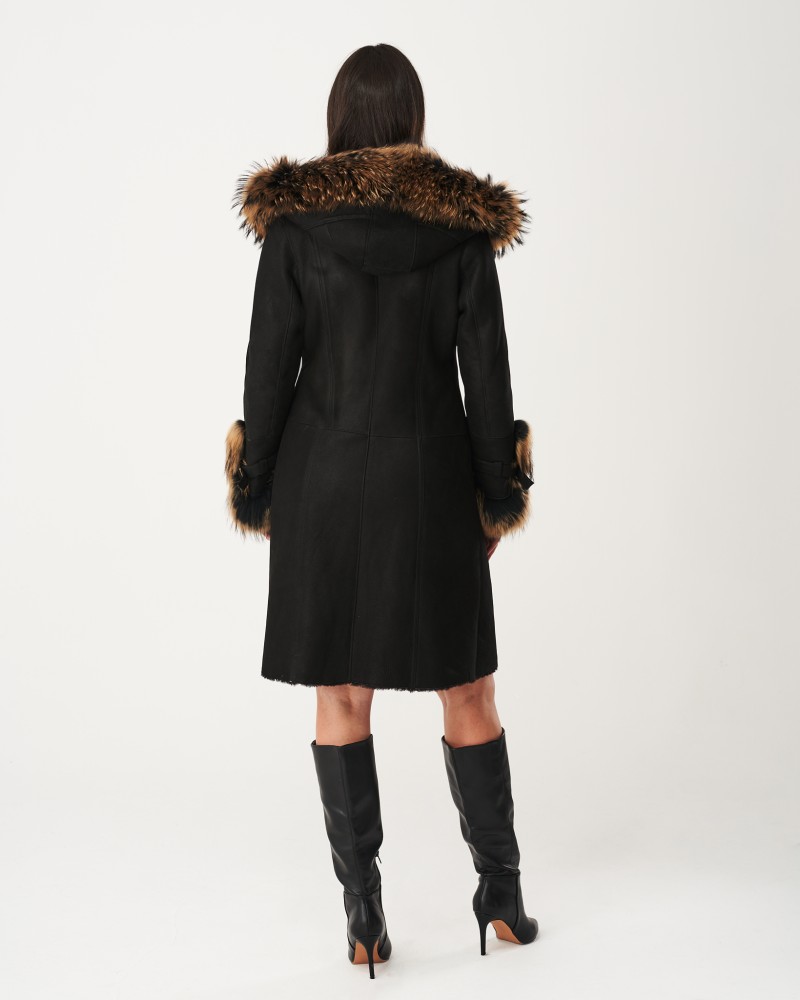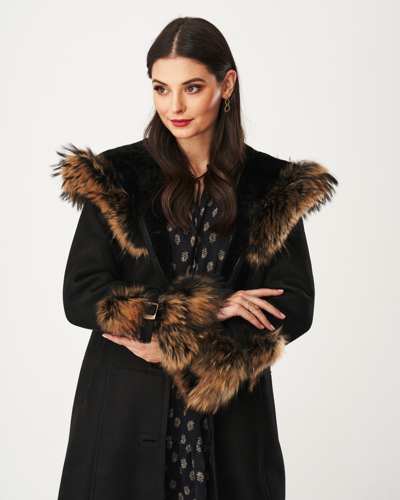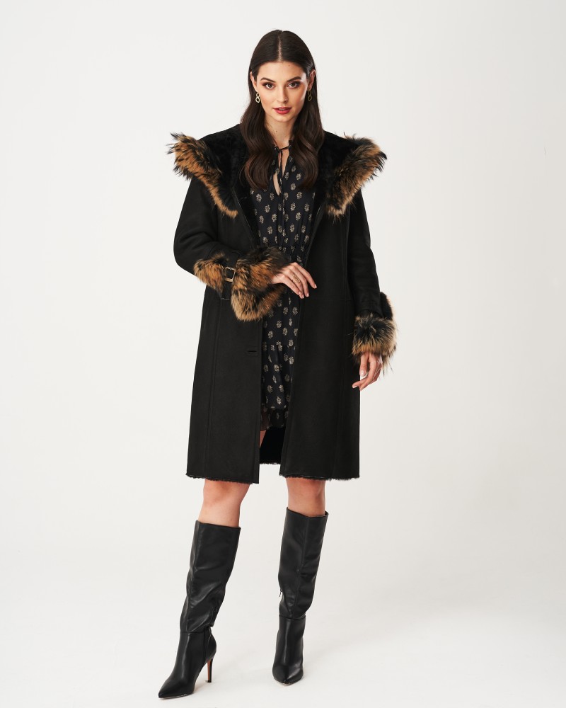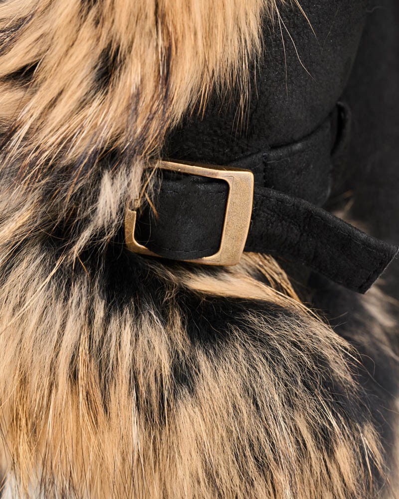 Kożuch damski Merin łączy w sobie praktyczność i wytrzymałość naturalnej skóry owczej, która rewelacyjnie chroni nie tylko przed mrozem, lecz także wiatrem i śniegiem z niepowtarzalnym wyglądem naturalnego futra z jenota. Wstawki obecne przy rękawach oraz funkcjonalnym, obszernym kapturze dodają projektowi niepowtarzalnego charakteru, zachęcając do wtulenia się w miękkie futerko w najzimniejsze dni roku. Rękawy zostały dodatkowo wzbogacone klamrami, które idealnie uzupełniają całość projektu.