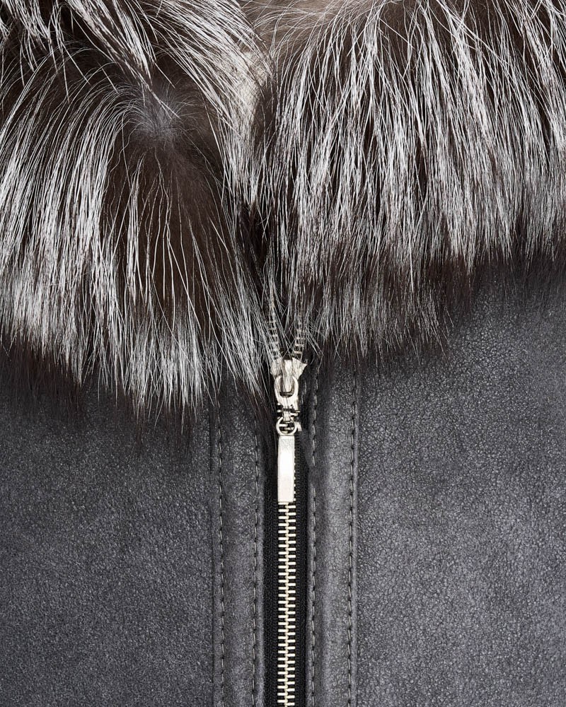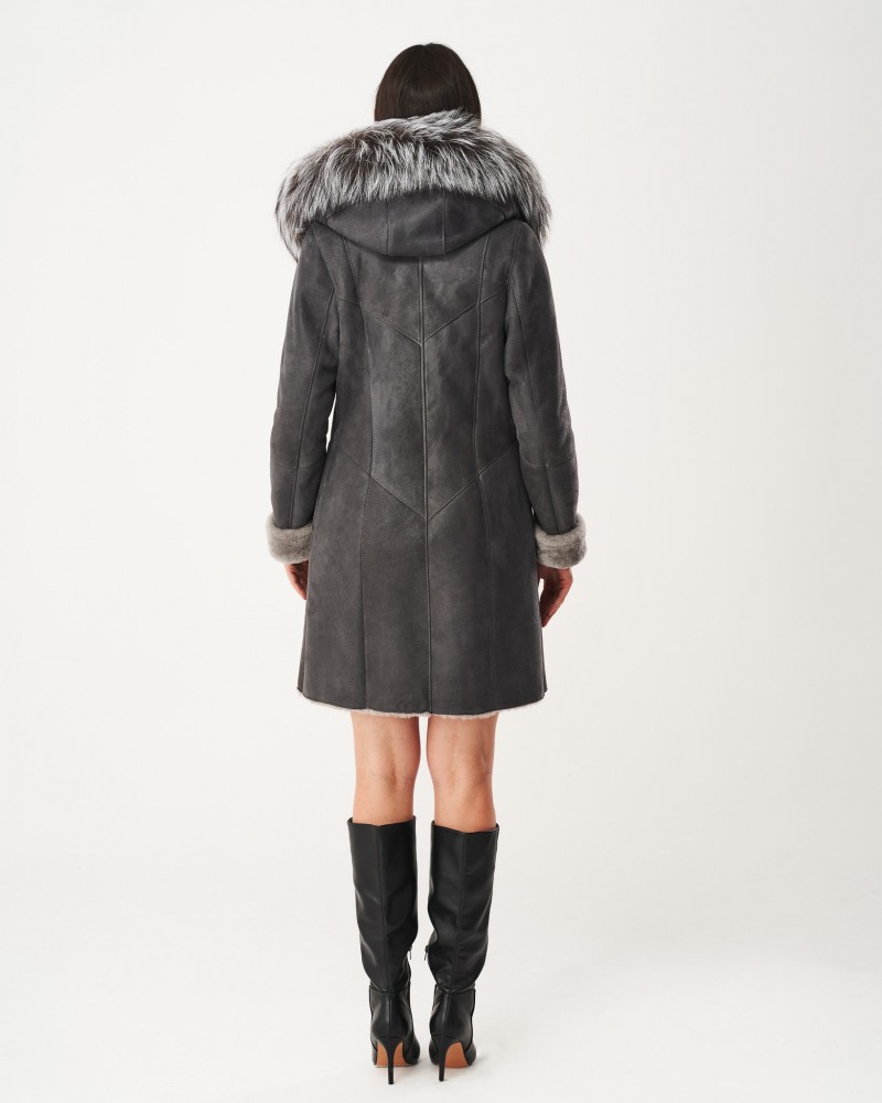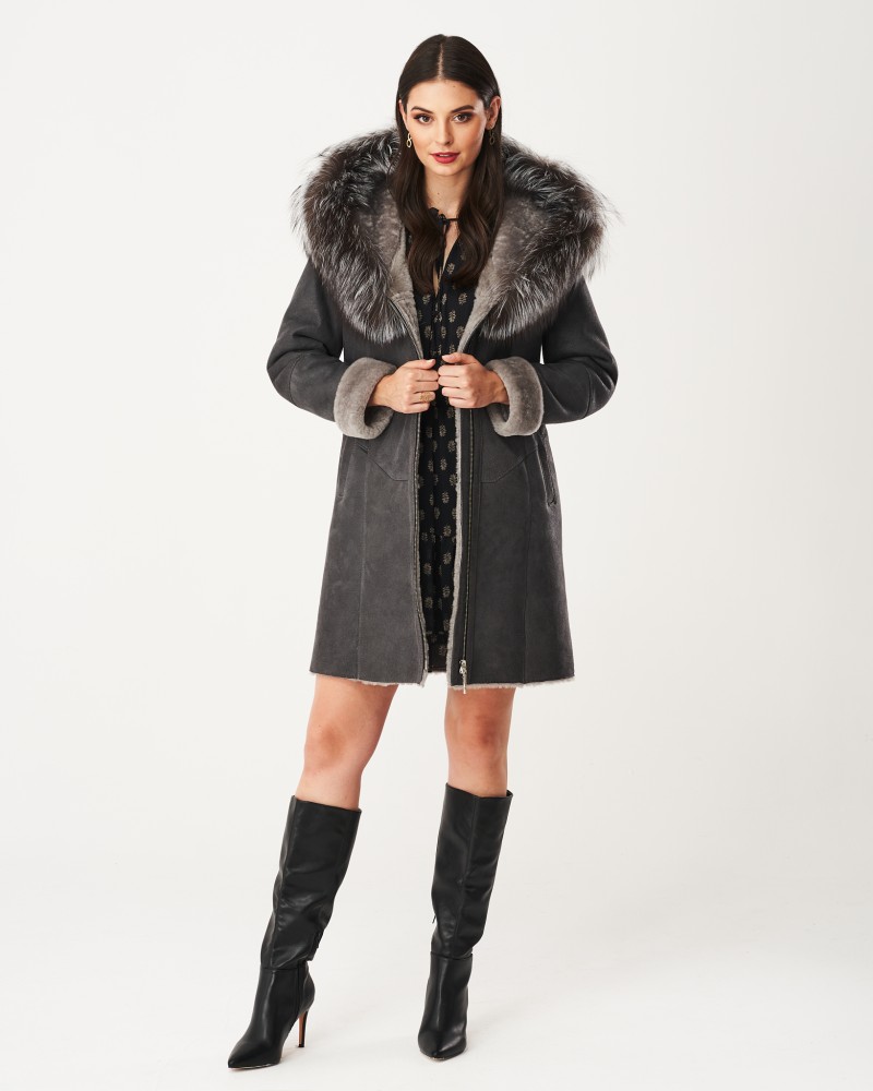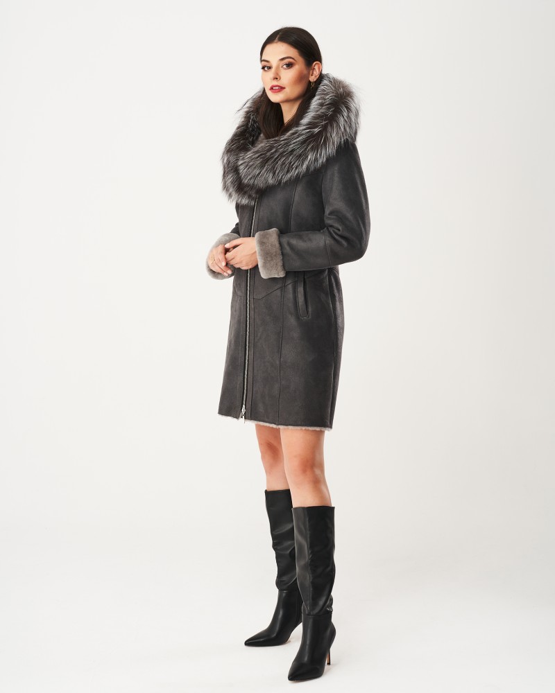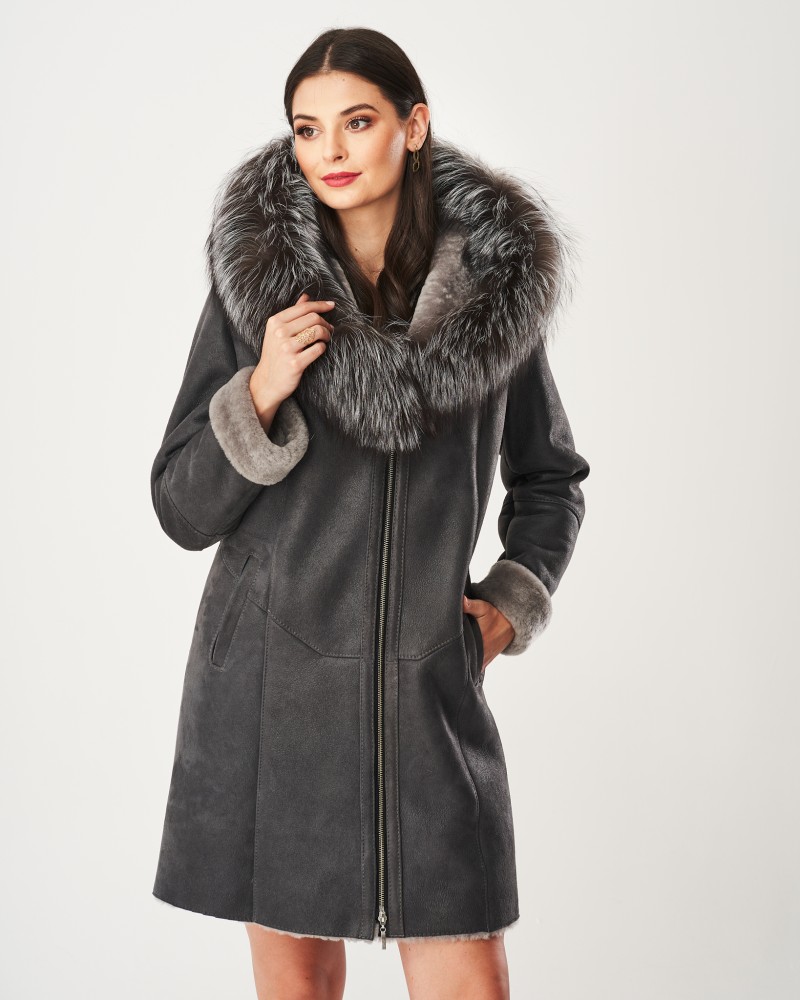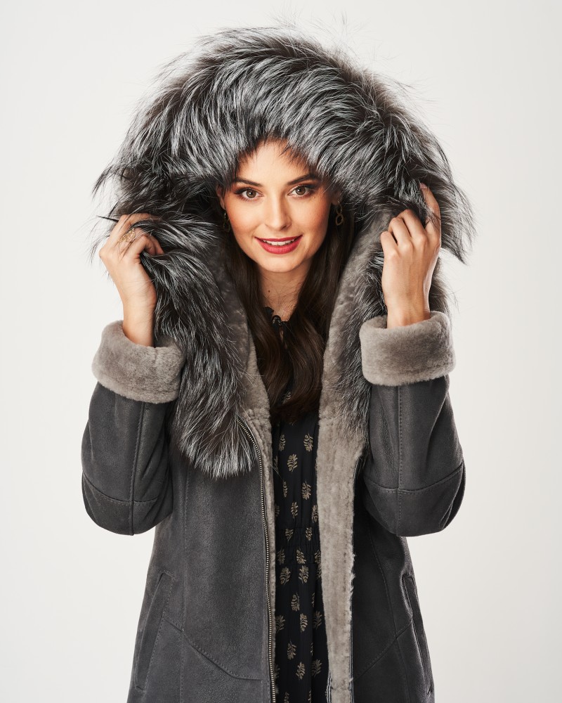 Kożuch damski Nestia posiada prosty krój i długość sięgającą do połowy uda, dlatego znakomicie układa się na każdym typie sylwetki. Warto rozważyć zestawienie go z wysokimi botkami, bowiem w tym wydaniu prezentować się będzie nad wyraz korzystnie. Obszerny, chroniący przed niepogodą kaptur obszyty został przepięknym, cudownie miękkim, naturalnym lisem, zachęcającym do wtulenia się w niego w naprawdę zimne dni. Rękawy wykończono miłym w dotyku futerkiem, które idealnie komponuje się z innymi elementami modelu.