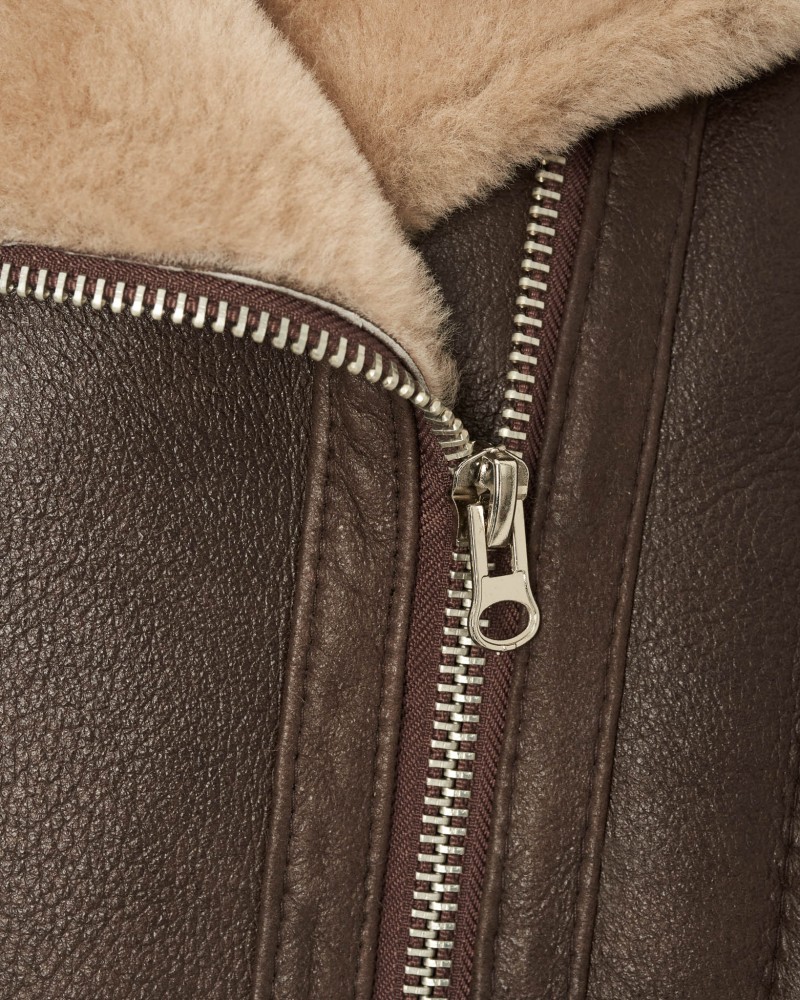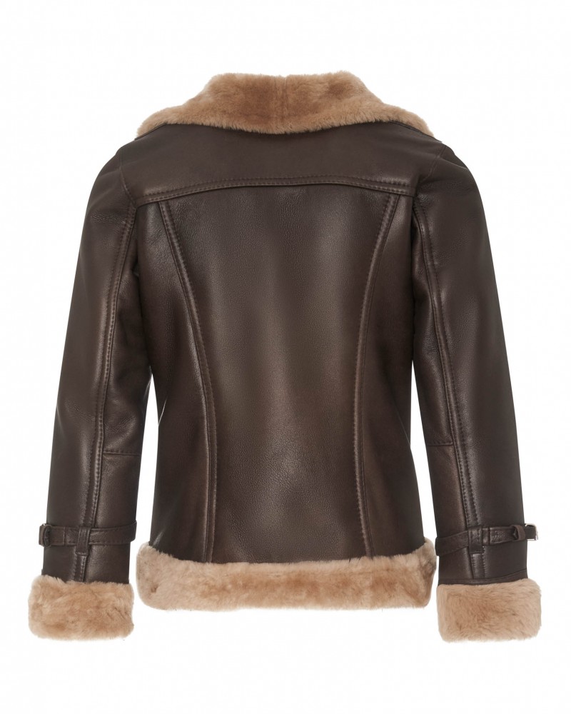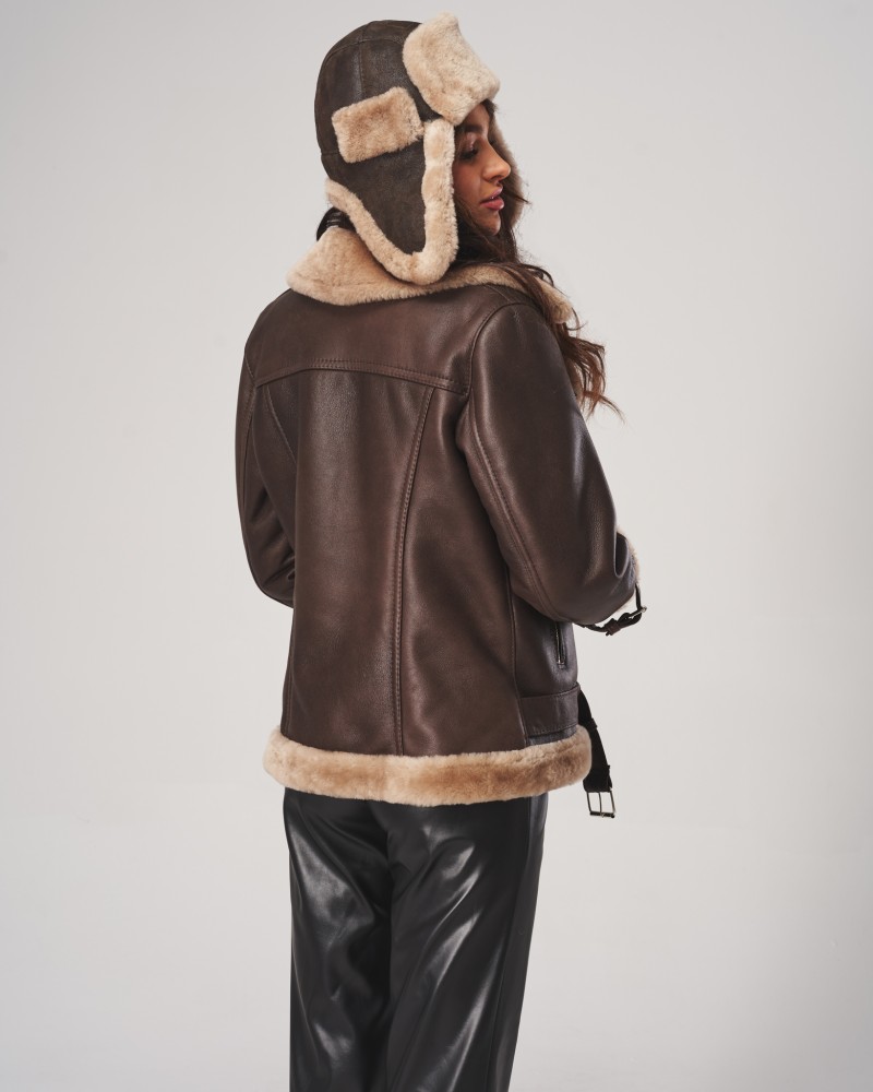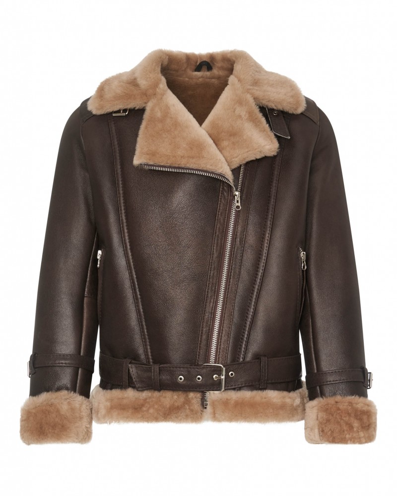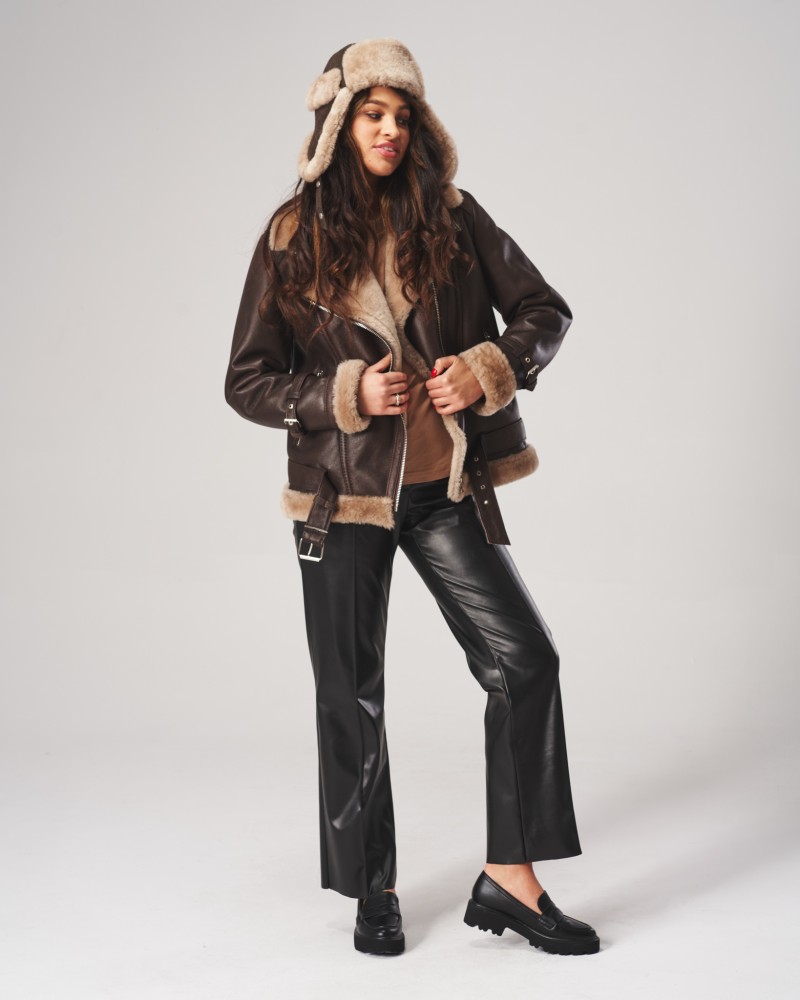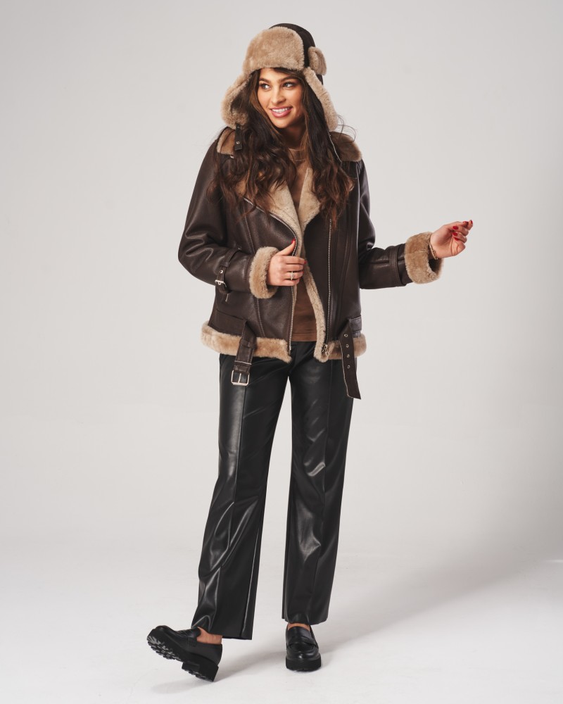 Kożuch damski Raisa utrzymany został w stonowanej kolorystyce, w której dominują odcienie brązów i beżów, dzięki czemu bez problemu dopasuje się do większości zimowych stylizacji. Fason uwielbianej przez kobiety ramoneski zapewnia niezwykły wygląd oraz niepowtarzalny komfort noszenia. Zapięcie na wszyty lekko po skosie zamek błyskawiczny oraz znajdujący się u dołu pas z klamrą umożliwiający swobodną regulację obwodu kożucha to praktyczne i funkcjonalne rozwiązania, które docenisz podczas codziennego użytkowania.
