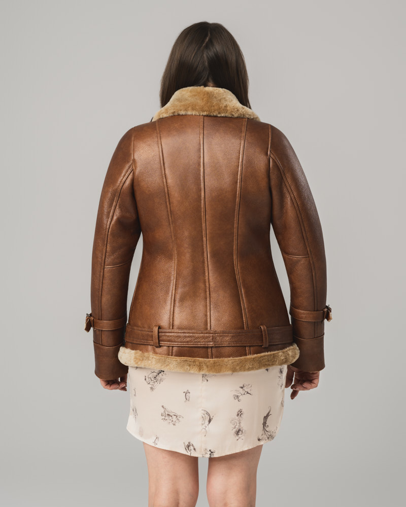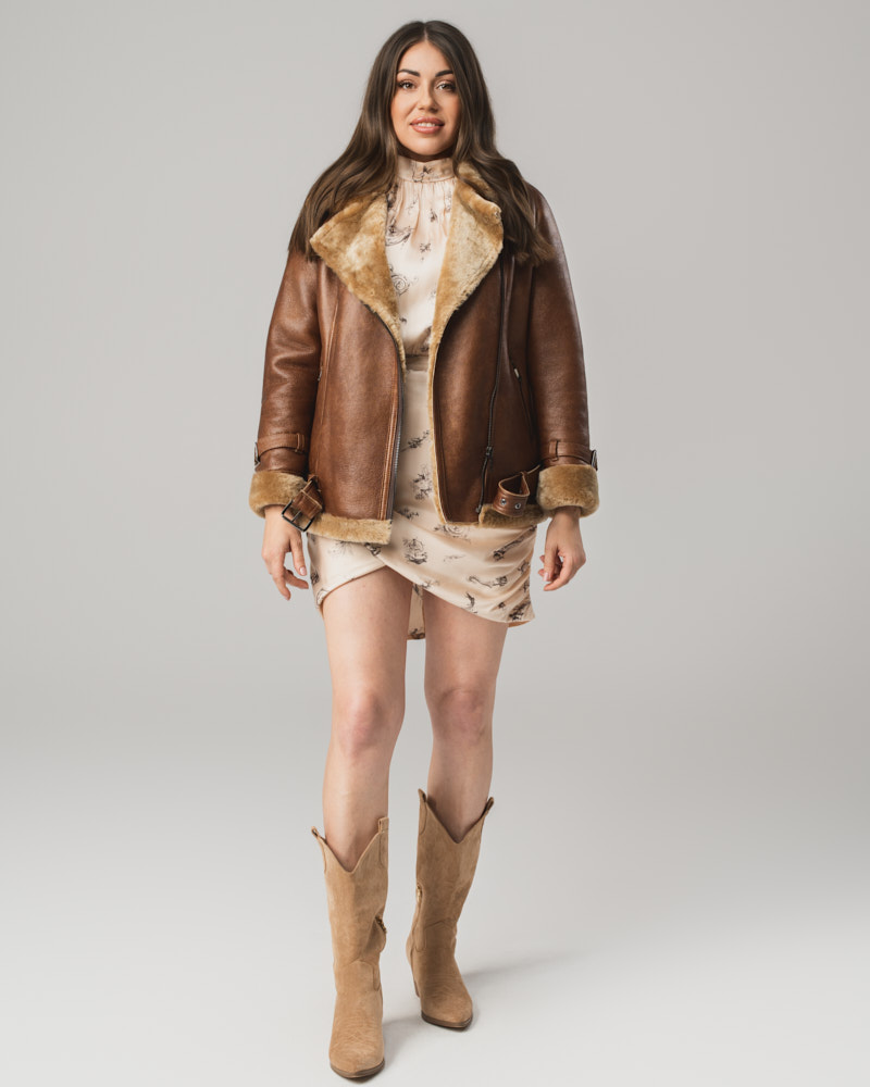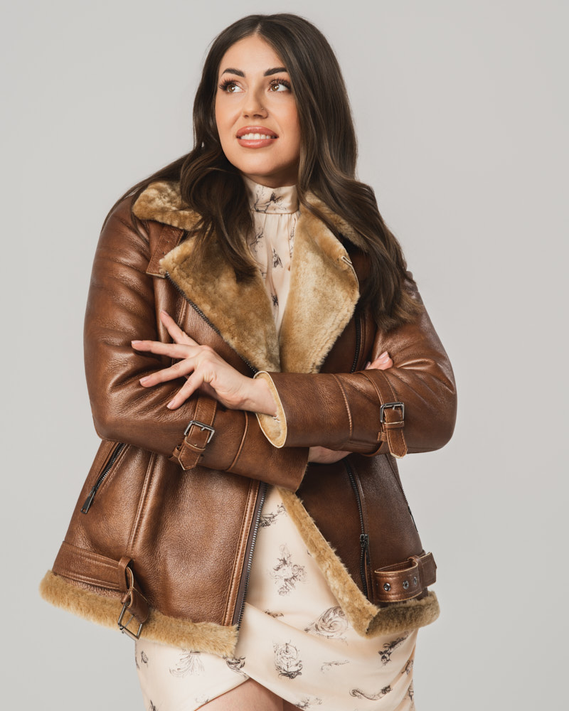 Kożuch damski Raisa zachwyca dopracowanymi detalami asymetryczny zamek, szeroki kołnierz i skórzany pasek w talii podkreślają jego nowoczesny, miejski charakter. Stylowe klamry przy rękawach dodają całości wyrazistości, a futrzane wykończenie przy dolnej krawędzi wprowadza nutę miękkości. Każdy element został starannie uszyty ręcznie, z dbałością o precyzję i trwałość, dzięki czemu Raisa nie tylko zachwyca wyglądem, ale także służy przez wiele sezonów.