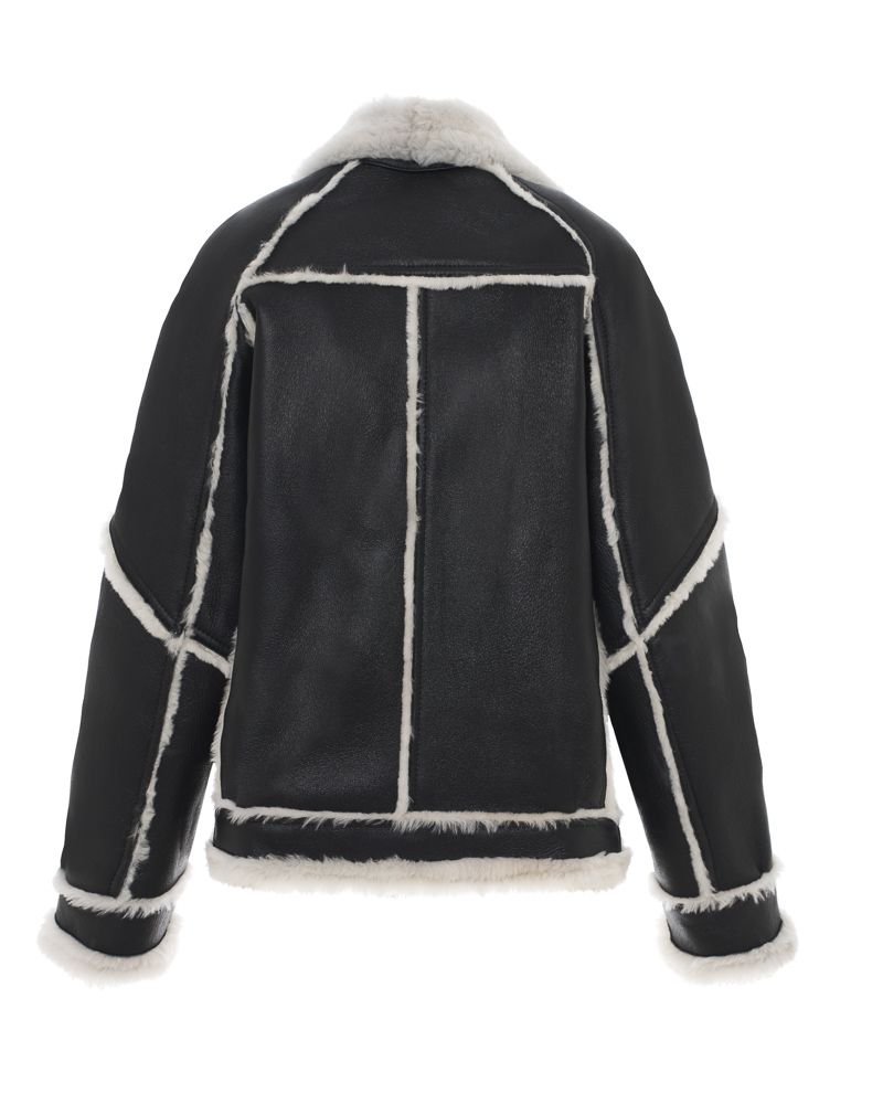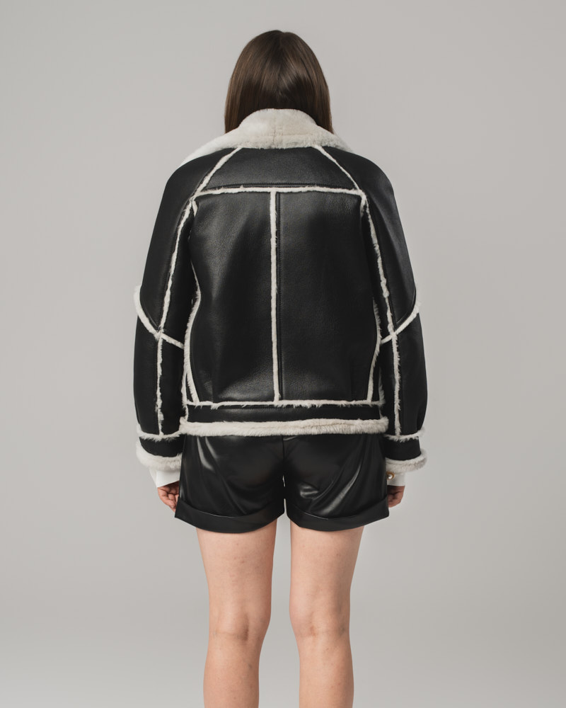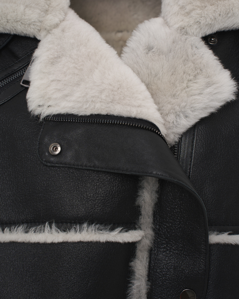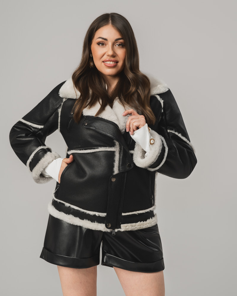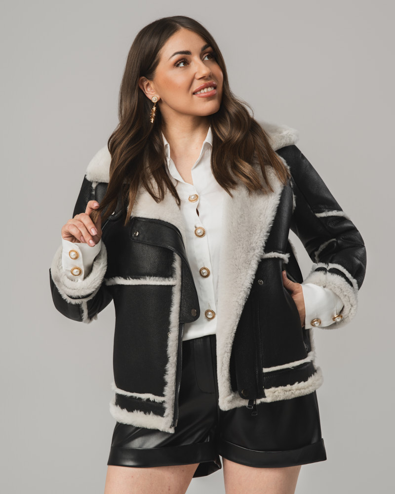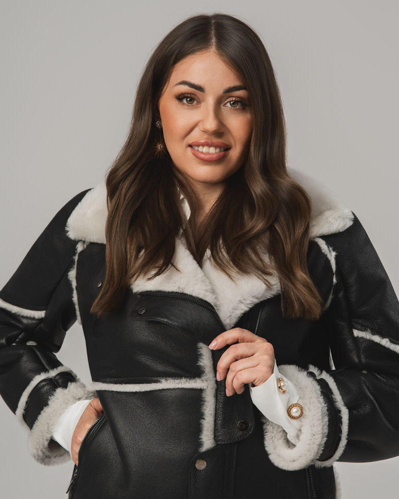 Kożuch damski Selena wykończony jest charakterystycznym obszyciem typu shearling, które biegnie wzdłuż rękawów, boków i linii pleców, tworząc efektowną, geometryczną strukturę. Futrzane krawędzie i wnętrze dodają przytulności i miękkości, a całość zachowuje niezwykłą lekkość mimo solidnej konstrukcji, kożuch pozostaje wyjątkowo komfortowy w noszeniu. Szeroki kołnierz z futerkiem można nosić klasycznie lub lekko postawić, dodając stylizacji wyrazistości i ochrony przed chłodem.