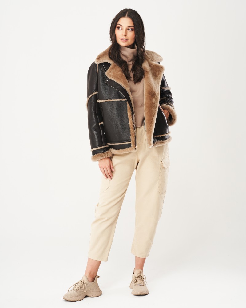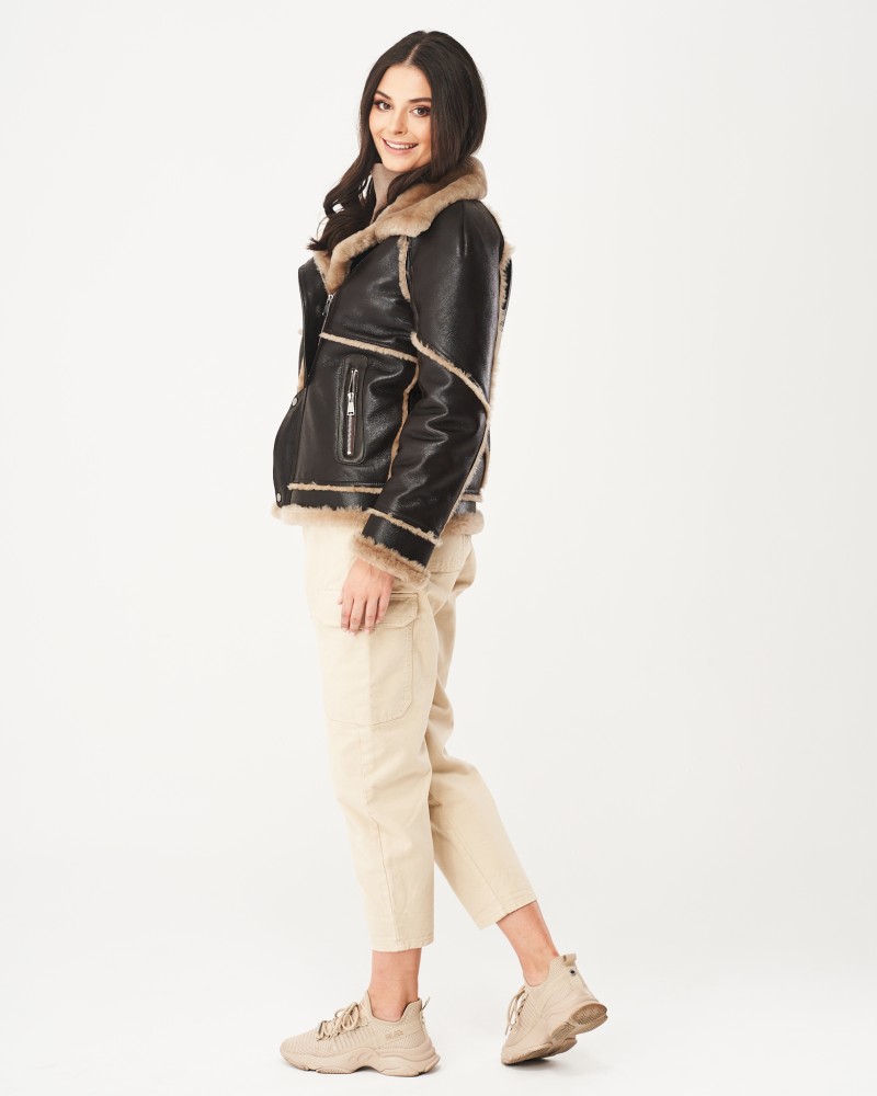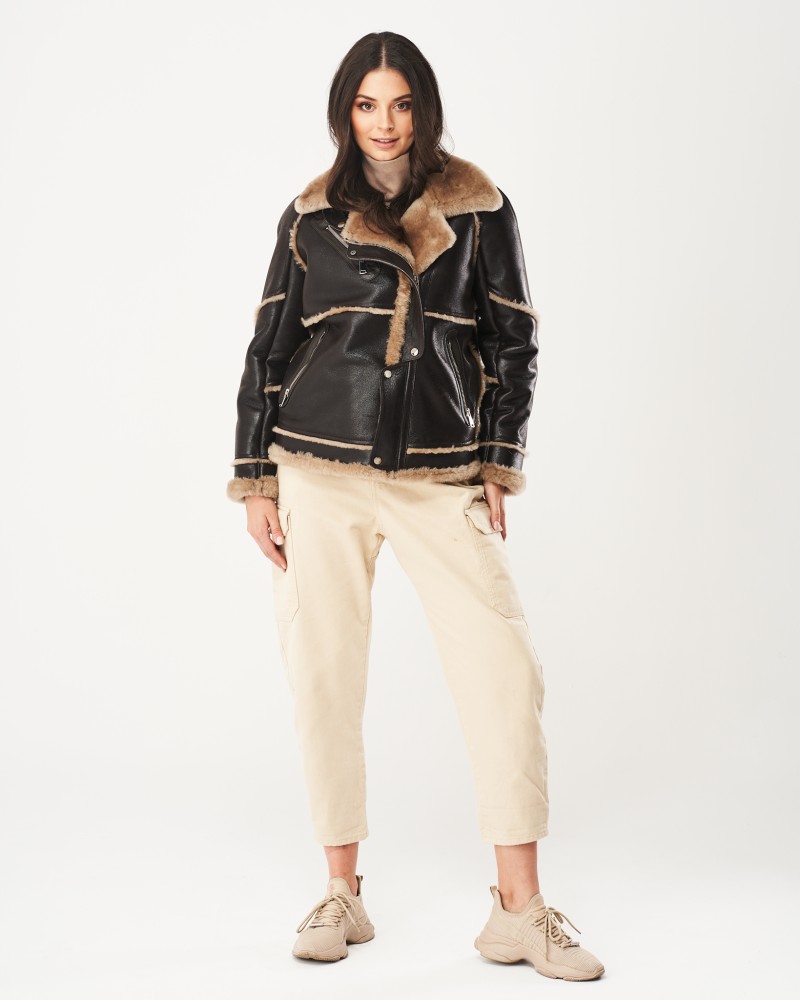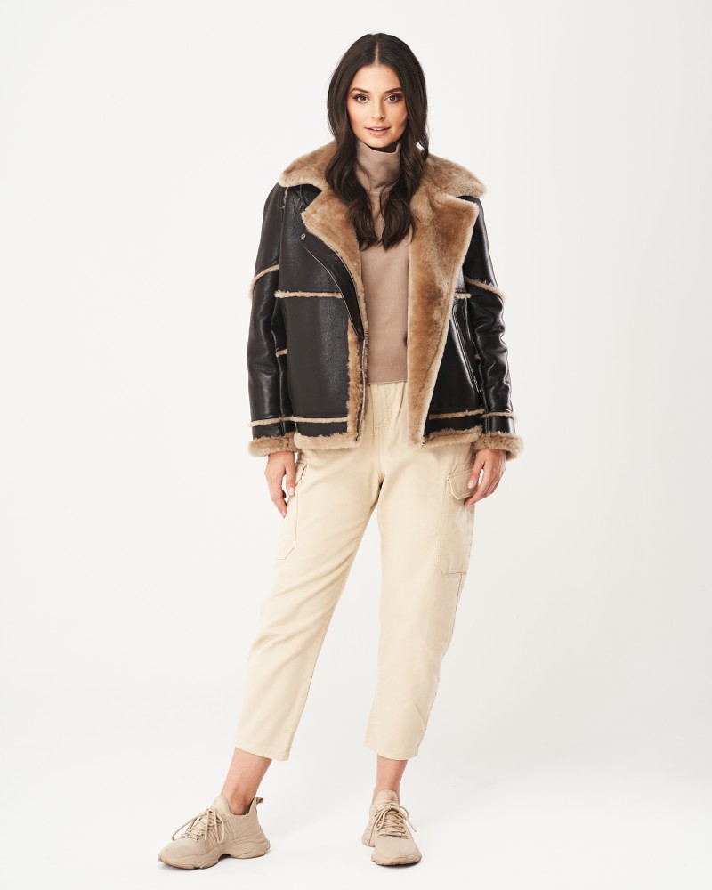• Przedstawiony na zdjęciu kożuch jest w kolorze brąz – jasny spód