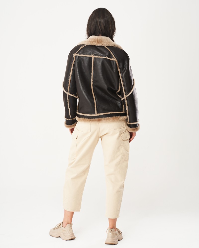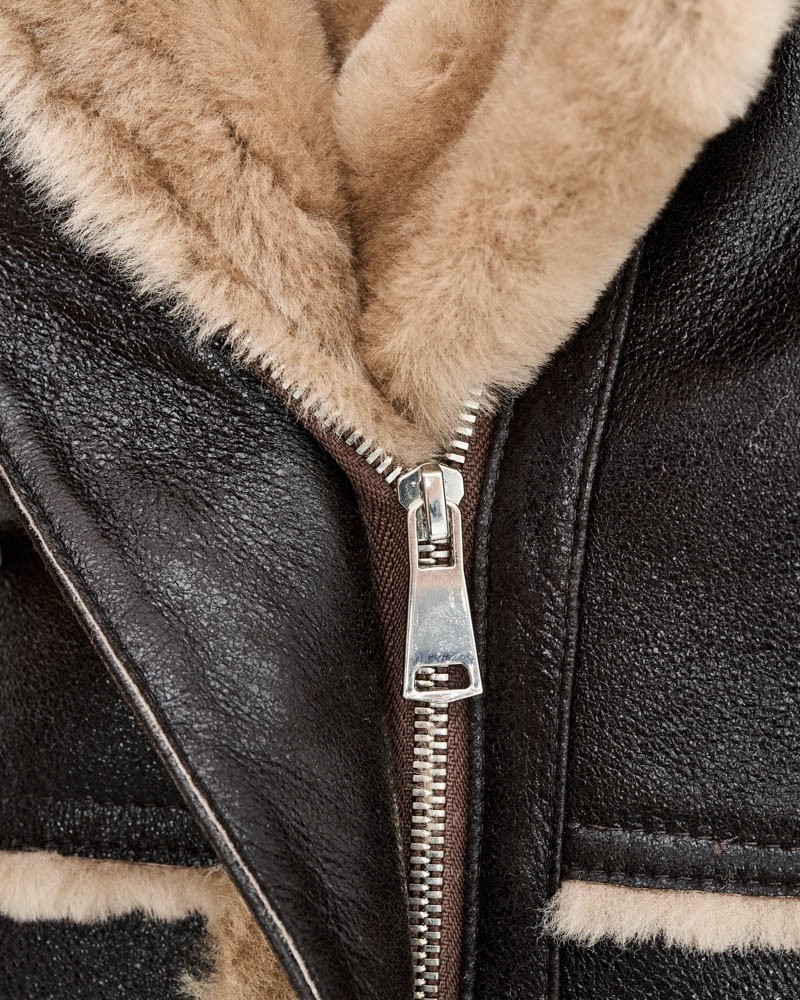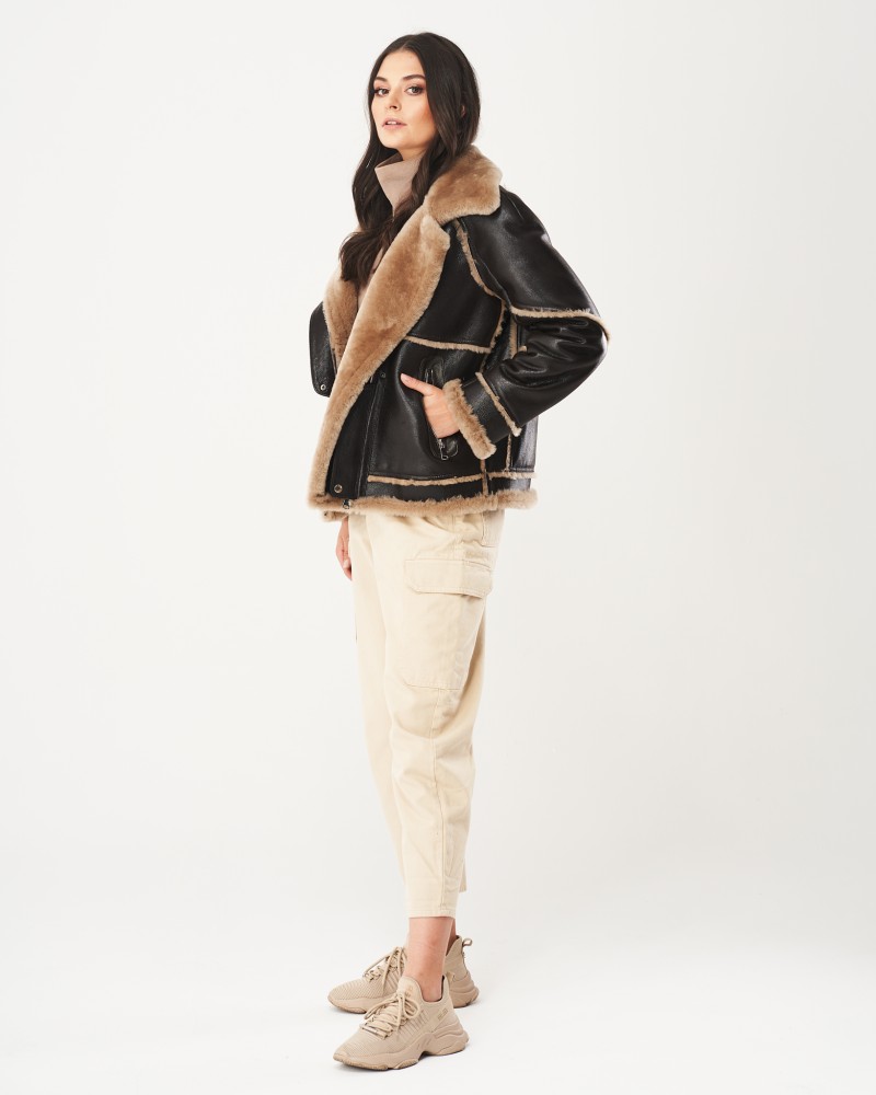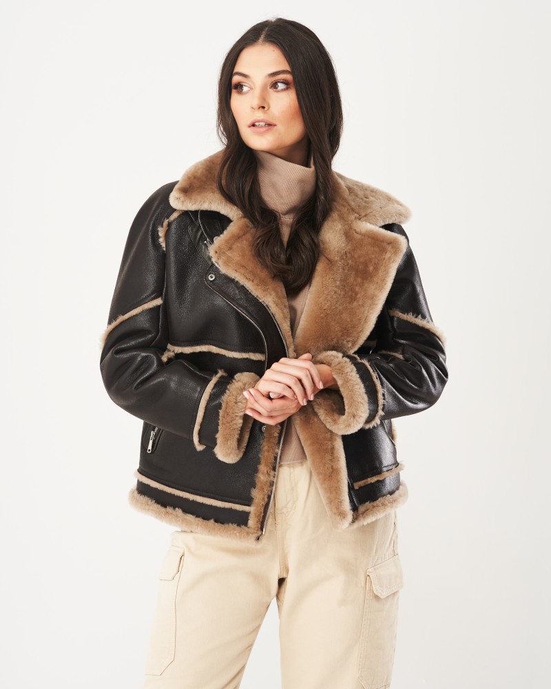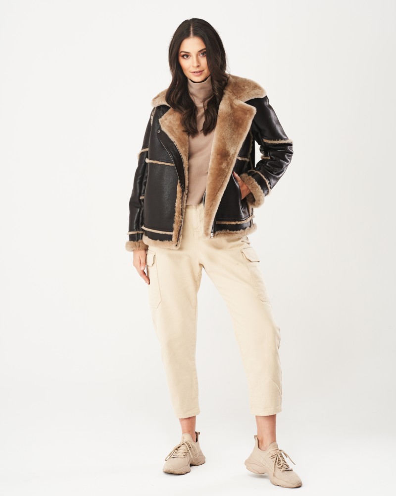 • Przedstawiony na zdjęciu kożuch jest w kolorze brąz – jasny spód