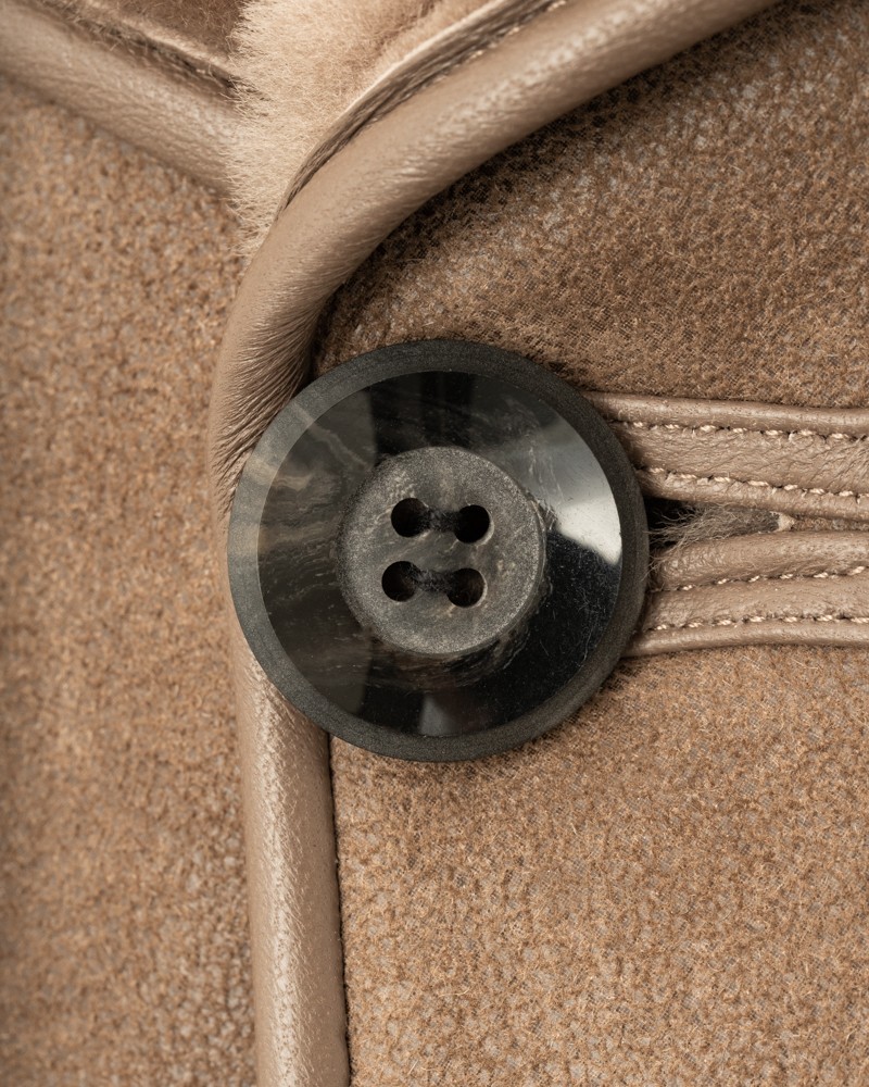 Kożuch męski Aksel posiada długość do bioder. Jest on nieco dłuższy od klasycznej marynarki, dzięki czemu z powodzeniem zakryje znajdujące sie pod nim elementy garderoby. Zapięcie na duże, ozdobne guziki ułatwia użytkowanie na co dzień i doskonale konweniuje z całością. Miękki, futrzany, wykładany kołnierz z klapami również został skrojony w stylu męskiej marynarki. Efektowne przeszycia nadają kożuchowi niepowtarzalnego charakteru. Prosty, luźny fason zapewnia swobodę ruchów i wygodę noszenia.