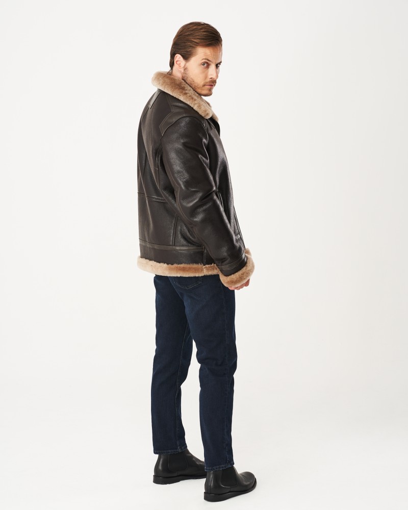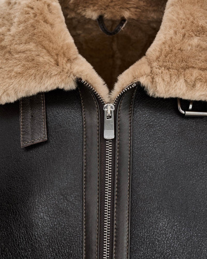 Kożuch męski David posiada klasyczny fason, który nie krępuje ruchów i zapewnia dużo luzu i swobody. Uszyty w długości do bioder, chroni nerki i dolne partie ciała przed wychłodzeniem. Zapięcie na dobrej jakości błyskawiczny zamek nierdzewny zwiększa praktyczność modelu. Wykładany kołnierz, mankiety długich rękawów i dół projektu zdobi jasnobeżowe, naturalne, miękkie futerko owcze, pięknie kontrastujące kolorystycznie z głębokim, ciemnobrązowym kolorem licowej skóry kożucha. Dwa małe paski skórzane zapinane na klamerkę pozwalają w bardzo zimne dni zrobić z kołnierza ciepłą, otulającą szyję stójkę. Przód modelu i rękawy wykonano z gładkiej, licowej skóry owczej. Ozdobiono je jedynie naszytym cienkim paskiem skóry obecnym nad futerkowymi mankietami i dołem kożucha. Tył natomiast ożywiają efektowne, geometryczne przeszycia. Dwie boczne, zapinane na metalowe napy kieszenie pozwolą ogrzać zmarznięte dłonie.
