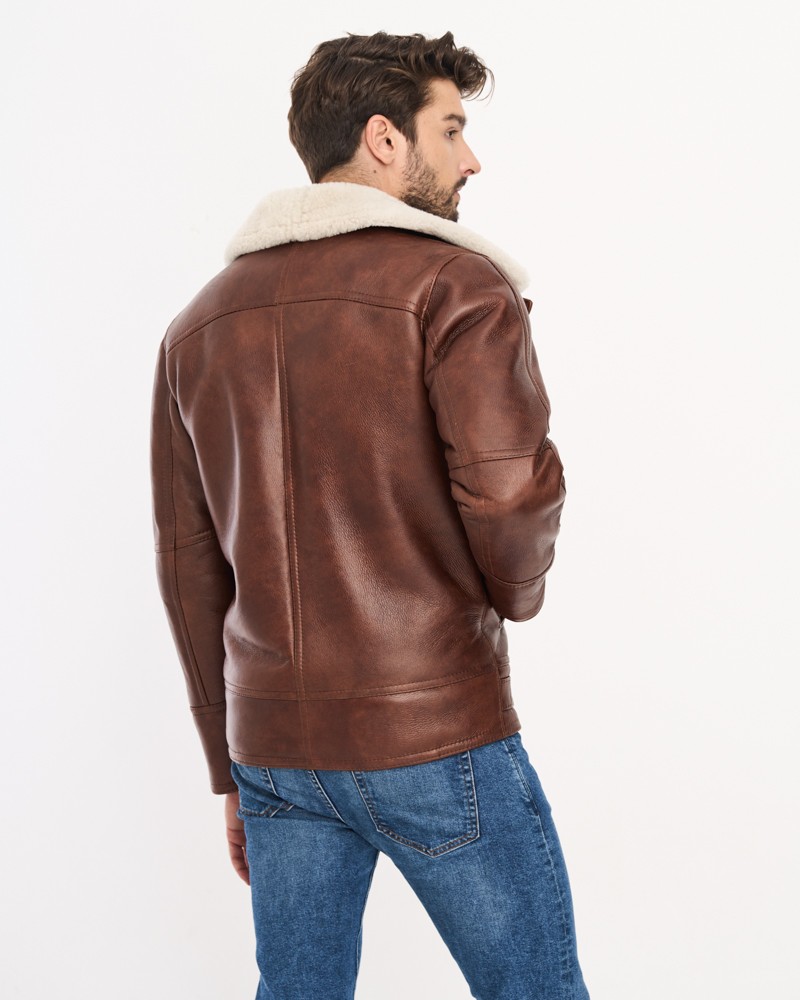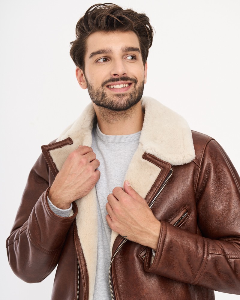Kożuch męski Mateo uszyto w stylu ramoneski o długości do bioder, z prostymi rękawami, wzbogaconymi ukośnymi przeszyciami. Wykładany, futrzany kołnierz z klapami jest miły i miękki w dotyku, a doszyty pasek z metalową klamerką pełni nie tylko funkcję ozdobną, ale pozwala na szczelne zapięcie pod szyją. Kożuch zapinany jest na zamek błyskawiczny, wszyty nieco asymetrycznie wpisuje się w najnowsze trendy mody. Dwie boczne kieszenie wszyto tradycyjnie, dyskretnie je zaznaczając przeszyciem. Trzecią kieszeń, zapinaną na zamek błyskawiczny naszyto ukośnie, na linii klatki piersiowej.
