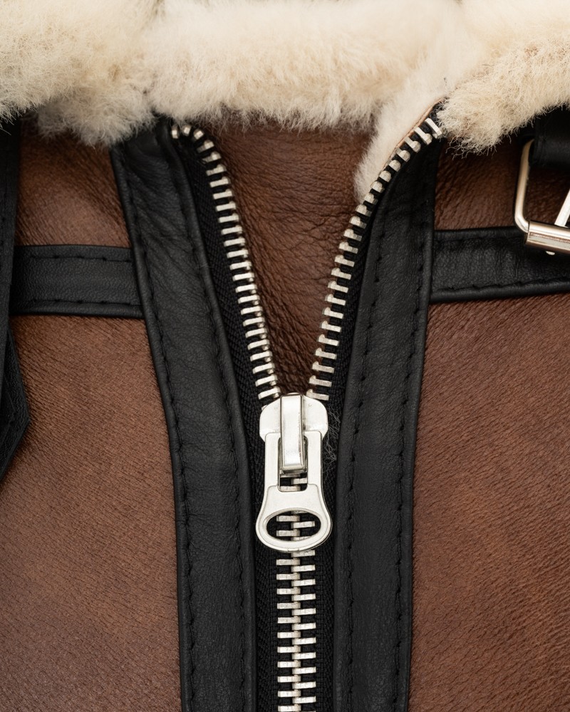 Kożuch męski Stanley skrojono klasycznie. Fason nie krępuje ruchów i zapewnia wiele swobody. Wygodne zapięcie na zamek błyskawiczny ułatwia codzienne użytkowanie kożucha. Wykładany kołnierz, dół i mankiety długich rękawów zdobi jasna, naturalna, owcza skóra, pięknie kontrastująca z głębokim, ciemnym kolorem kurtki. Dwa małe paseczki przy kołnierzu, zapinane na klamry, pozwalają zrobić z niego stójkę, co jest szczególnie przydatne, kiedy spadną słupki rtęci. Na dole kurtki pasek do swobodnej regulacji pozwala na indywidualne dopasowanie jej do sylwetki. Kożuch nie posiada kaptura.