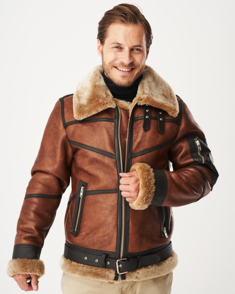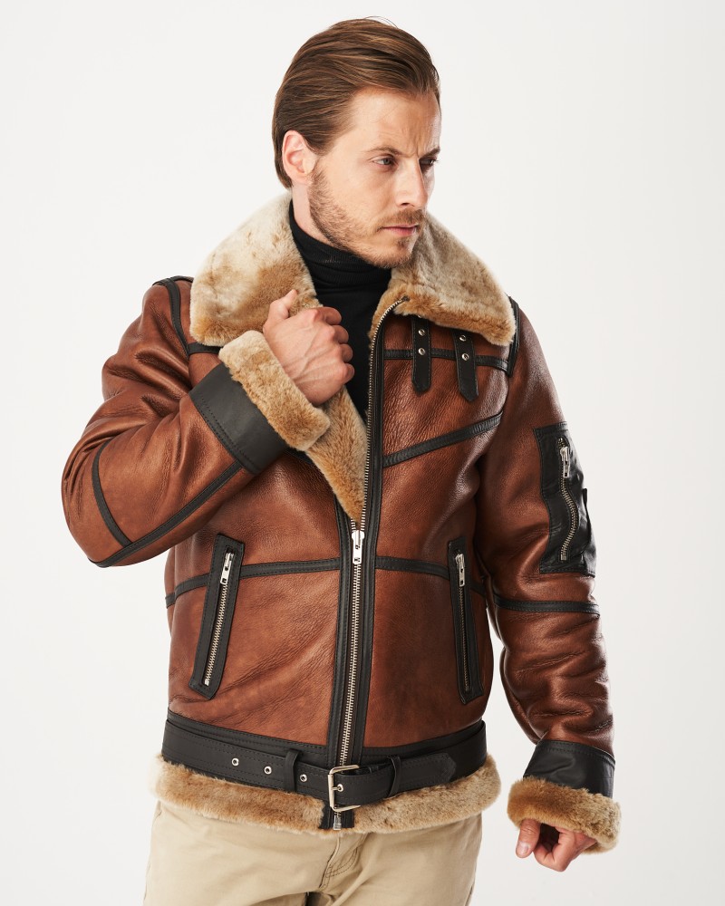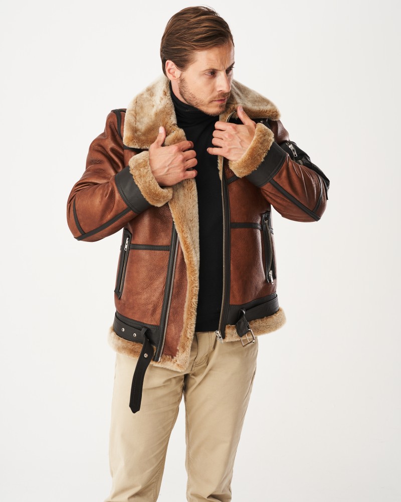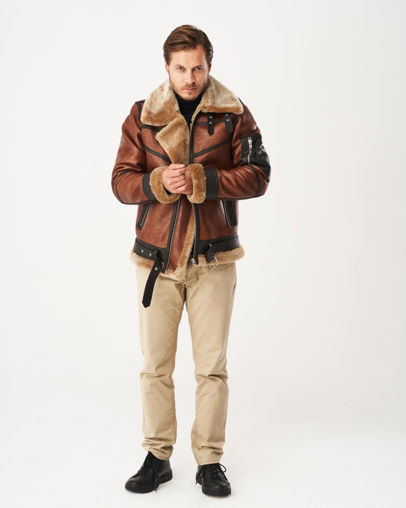 Naturalny męski kożuch Stanley posiada klasyczny krój męskiej kurtki o długości do bioder. Miękki, futrzany kołnierz otula szyję, a doszyte do niego skórzane paski z klamerką mogą przeobrazić go w wysoką stójkę i ochronić Cię przed wdzierającym się zimnem i wiatrem. Kożuch zapinany jest pod szyję na nierdzewny, trwały zamek błyskawiczny, który po rozchyleniu tworzy puszyste klapy w kolorze przypalonego karmelu. Całość modelu zdobią oryginalne geometryczne i asymetryczne przeszycia utworzone z ciemnej, brązowej skórki. Dwie kieszenie po bokach i kieszeń na rękawie zapinane na zamki błyskawiczne również obszyto ciemną skórą. Mankiety i dół kożucha zdobi karmelowe futerko. Dodatkowy skórzany pasek pozwala na indywidualne dopasowanie modelu do sylwetki.