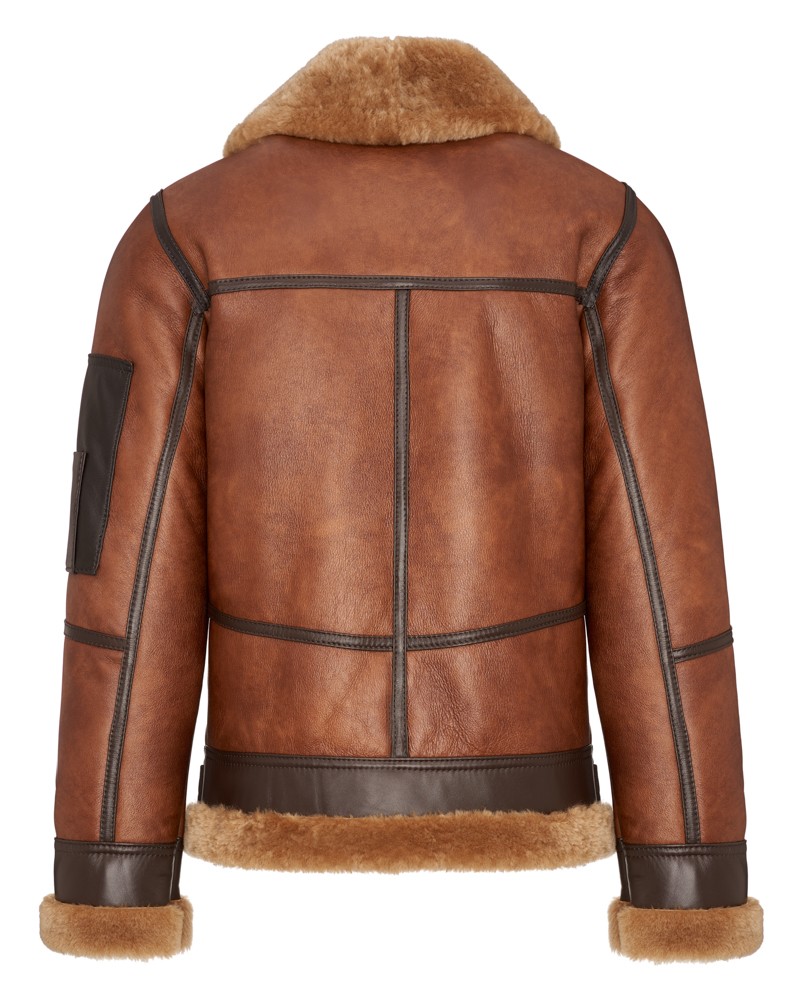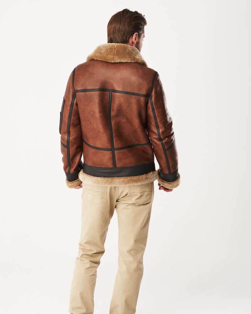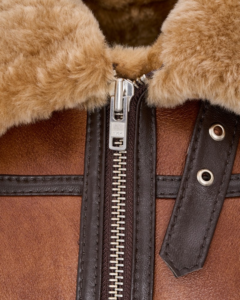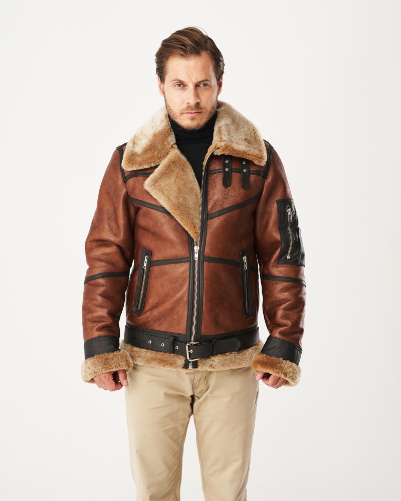 Naturalny męski kożuch Stanley posiada klasyczny krój męskiej kurtki o długości do bioder. Miękki, futrzany kołnierz otula szyję, a doszyte do niego skórzane paski z klamerką mogą przeobrazić go w wysoką stójkę i ochronić Cię przed wdzierającym się zimnem i wiatrem. Kożuch zapinany jest pod szyję na nierdzewny, trwały zamek błyskawiczny, który po rozchyleniu tworzy puszyste klapy w kolorze przypalonego karmelu. Całość modelu zdobią oryginalne geometryczne i asymetryczne przeszycia utworzone z ciemnej, brązowej skórki. Dwie kieszenie po bokach i kieszeń na rękawie zapinane na zamki błyskawiczne również obszyto ciemną skórą. Mankiety i dół kożucha zdobi karmelowe futerko. Dodatkowy skórzany pasek pozwala na indywidualne dopasowanie modelu do sylwetki.
