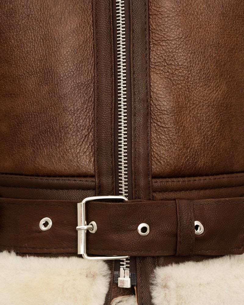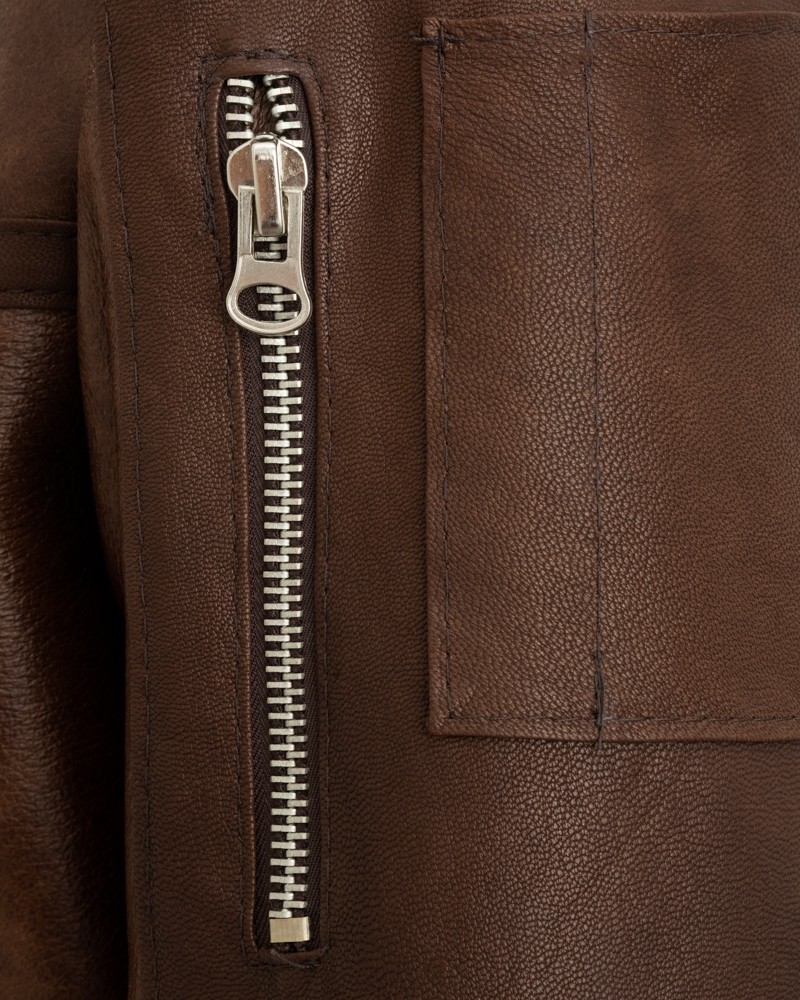 Kożuch męski Stanley skrojony klasycznie. Fason nie krępuje ruchów i zapewnia wiele swobody. Wygodne zapięcie na zamek błyskawiczny ułatwia codzienne użytkowanie kożucha. Wykładany kołnierz, dół i mankiety długich rękawów zdobi jasna, naturalna, owcza skóra, pięknie kontrastująca z głębokim, ciemnym kolorem kurtki. Dwa małe paseczki przy kołnierzu, zapinane na klamry, pozwalają zrobić z niego stójkę, co jest szczególnie przydatne, kiedy spadną słupki rtęci. Na dole kurtki pasek do swobodnej regulacji pozwala na indywidualne dopasowanie jej do sylwetki. Kożuch nie posiada kaptura.