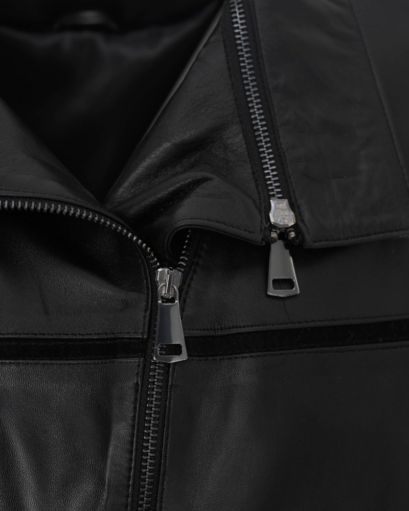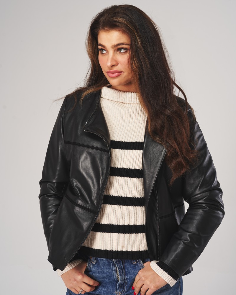 Kurtka skórzana damska Hinda czarna uszyta została z naturalnej jagnięcej skóry licowej oraz wzbogacona wstawkami z tej samej skóry w kontrastowym odcieniu. Tworzy to niebanalny design modelu, podkreślając jego niepowtarzalny charakter. Kurtka zapinana jest na wszyty nieco po skosie zamek błyskawiczny, podobnie jak praktyczne kieszenie boczne. Lekko taliowany fason oraz długość sięgająca w okolice bioder sprawiają, że model idealnie układa się na sylwetce, dodając swojej posiadaczce niepowtarzalnego stylu i klasy.