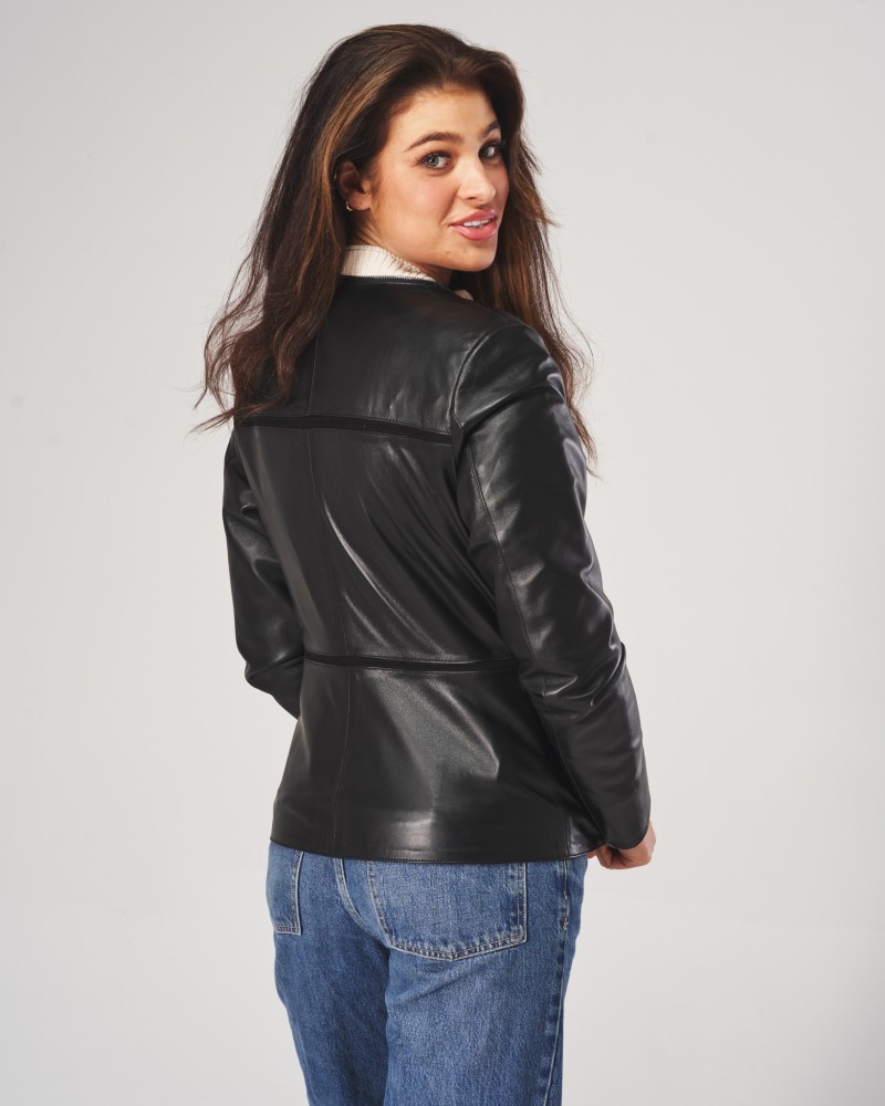 Kurtka skórzana damska Hinda czarna to jedyny w swoim rodzaju projekt, który po odpięciu kaptura oraz stójki w oka mgnieniu przeistoczy się w ponadczasową, uwielbianą przez kobiety chanelkę. Model uszyty został z naturalnej jagnięcej skóry licowej i wzbogacono go o wstawki z kontrastowej skóry licowej, dlatego zachwyca nie tylko praktycznością i uniwersalnością, ale też niebanalnym wyglądem.