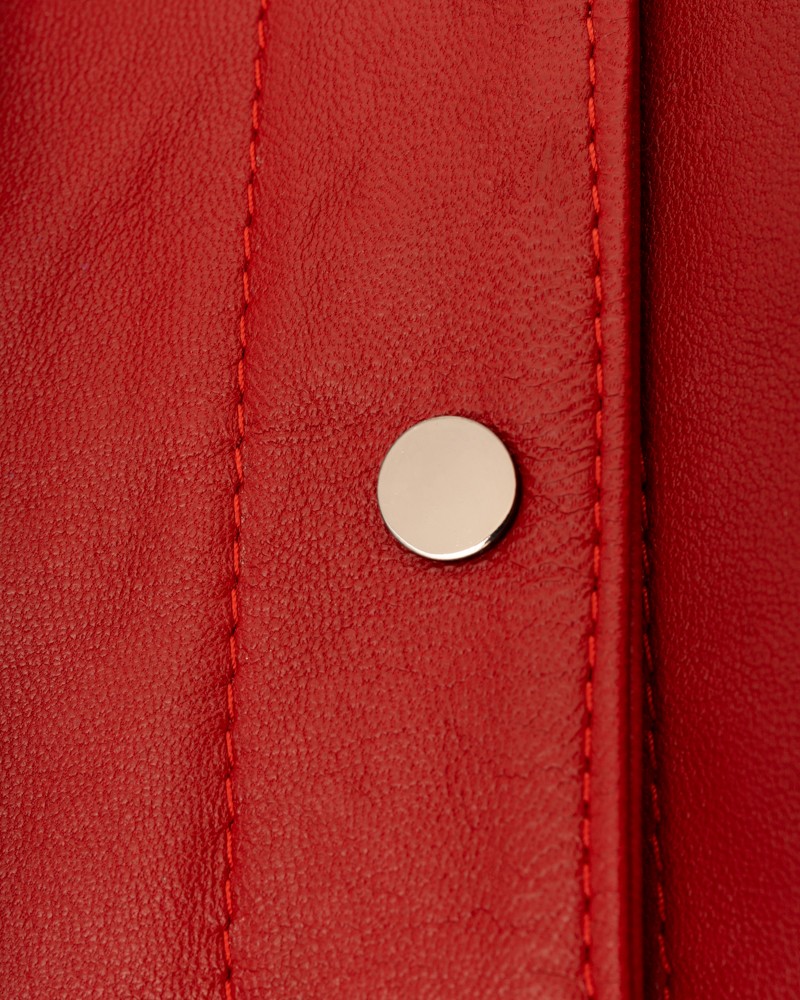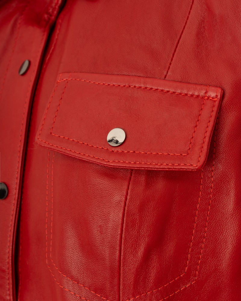 Kurtka skórzana damska Laila posiada ciekawe akcenty w formie zapinanych na zatrzaski parzystych piersiowych kieszeni, a także równie funkcjonalnych kieszeni bocznych. Wykładany kołnierzyk typu kent także wyposażono w zatrzask, który umożliwi lepsze schronienie się przed wiatrem i zimnem podczas niesprzyjającej aury. Cały model również zapinany jest na funkcjonalne zatrzaski, intrygująco odcinające się kolorystycznie od reszty projektu.