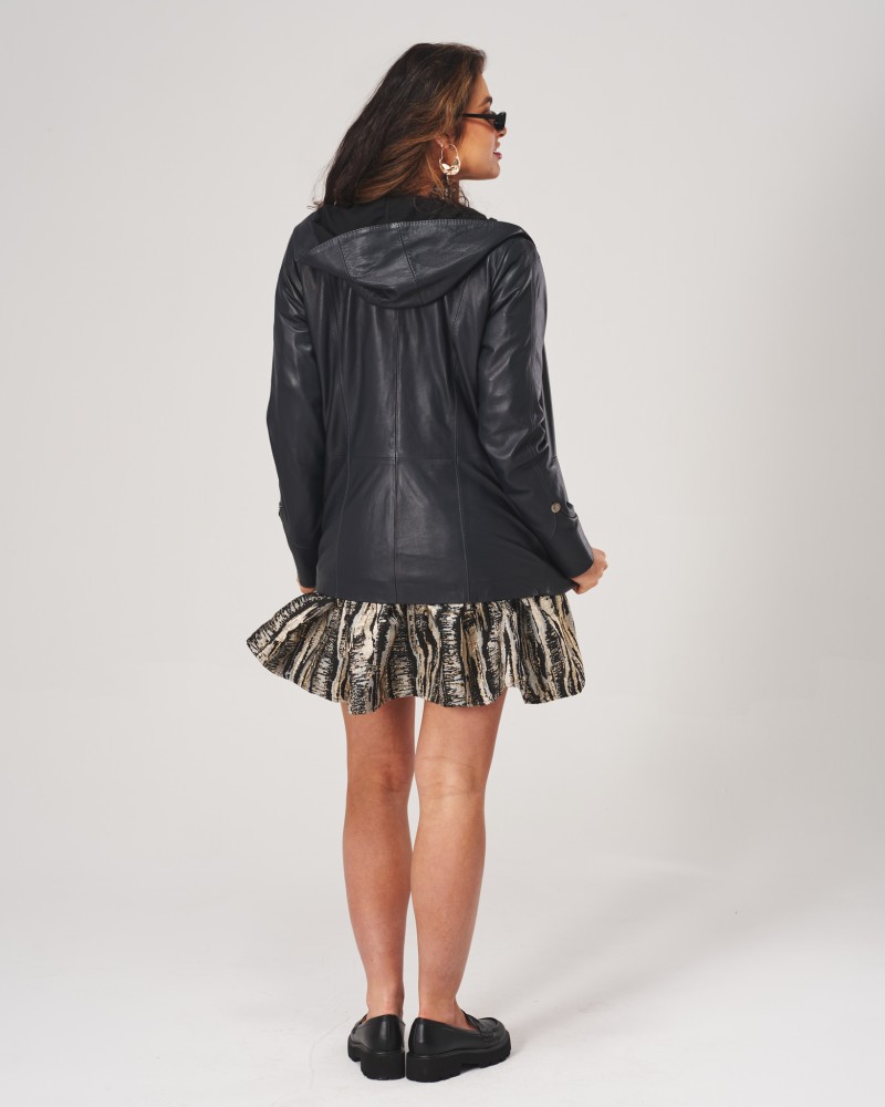 Kurtka skórzana damska Zenith to znakomita propozycja na chłodniejsze dni, gwarantująca wyjątkową izolację termiczną dzięki ociepleniu i kapturowi. Co więcej, model posłuży przez lata i będzie się atrakcyjnie prezentował bez względu na panujące w modzie trendy z powodu wykorzystania do produkcji miękkiej, naturalnej, jagnięcej skóry licowej. Długi, lekko taliowany krój kurtki sięgający za biodra doskonale komponuje się z kobiecymi kształtami, zapewniając wygodę i swobodę ruchów, a przy tym optycznie wysmuklając sylwetkę.