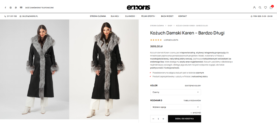 Emoris to polska marka z tradycją, która specjalizuje się w produkcji naturalnych kożuchów. Nasze wyroby powstają w dwóch własnych szwalniach, wyłącznie z polskich skór i w całości szyte są w Polsce dzięki temu wspieramy rodzimą gospodarkę i gwarantujemy najwyższą jakość. Choć głównym filarem naszej oferty są kożuchy naturalne, znajdziesz u nas także skórzane kurtki, kamizelki, czapki i inne dodatki.