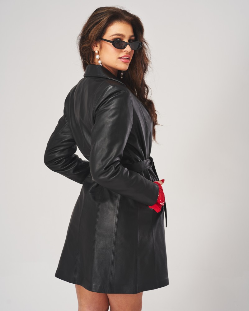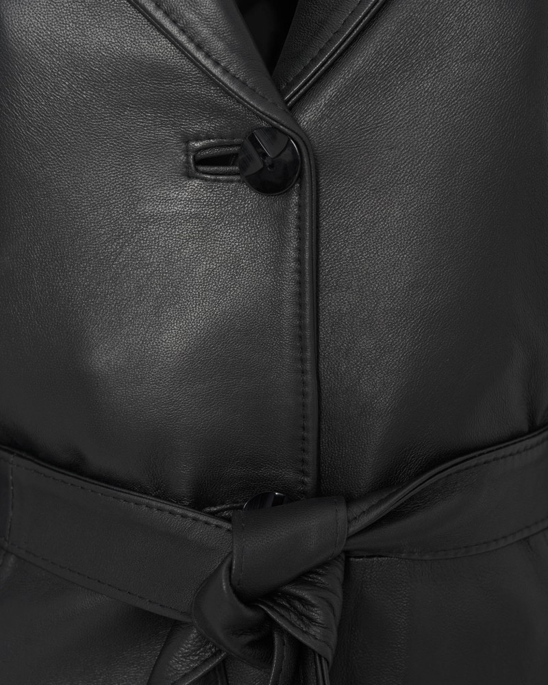 Płaszcz skórzany damski Mona zapinany jest na starannie przyszyte, wytrzymałe guziki. Po bokach posiada dwie praktyczne i funkcjonalne kieszenie, dodające mu nieco nonszalancji. Do modelu został dołączony dodatkowy pasek, idealny do przewiązania się w celu mocniejszego zaznaczenia kobiecych kształtów lub szczelniejszego otulenia się przed zimnem.