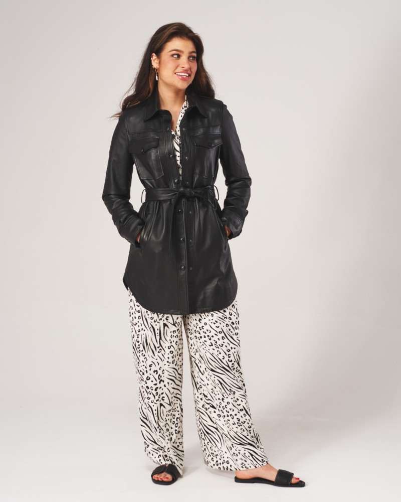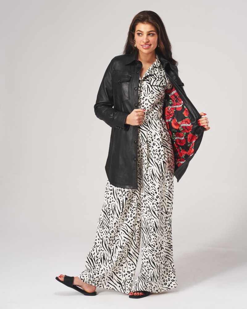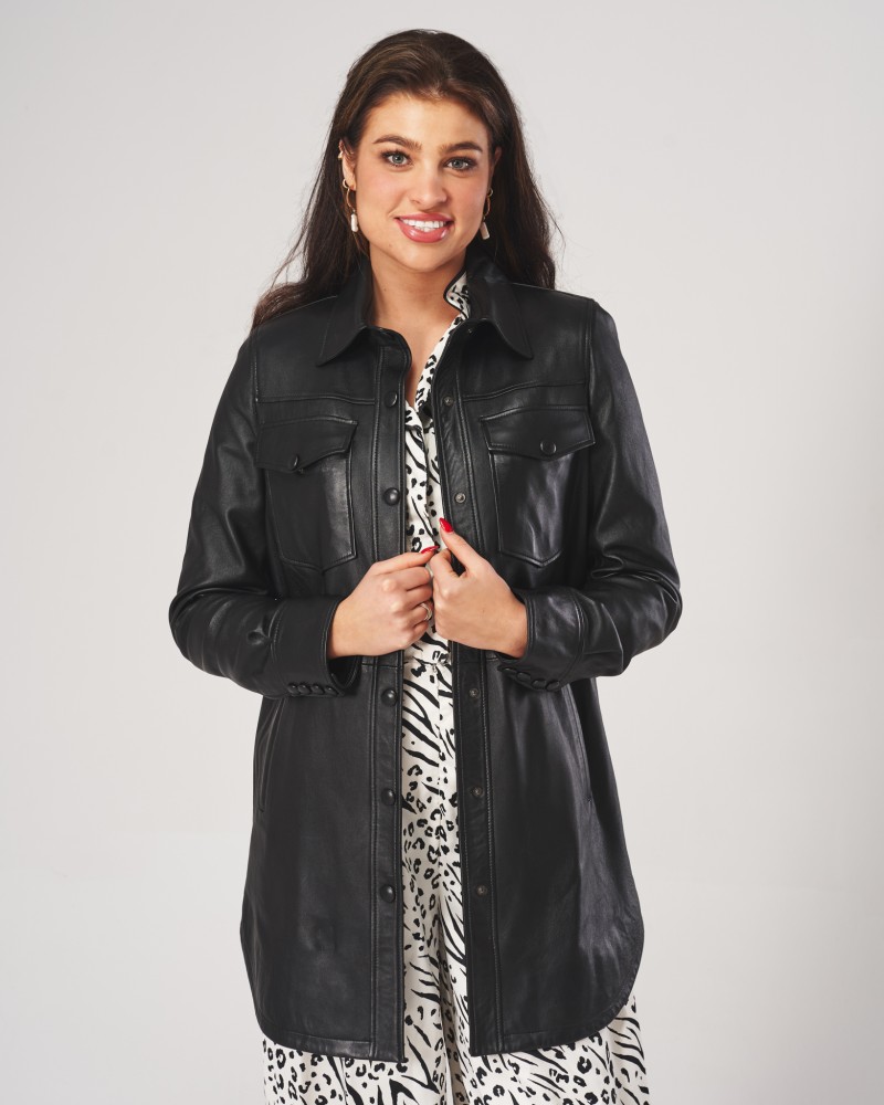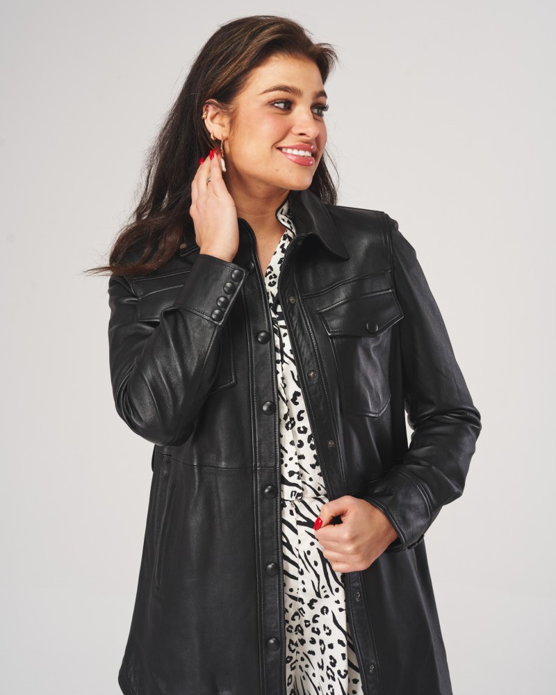 Płaszcz skórzany damski Najla przypomina wizualnie klasyczną koszulę, dlatego nie brakuje w nim elementów charakterystycznych dla tego typu odzieży. Pod szyją znajduje się elegancki i stylowy kołnierzyk. Na wysokości piersi widnieją dwie naszyte kieszenie zapinane, podobnie jak sam model, na stylowe zatrzaski. Na dole po bokach obecna jest kolejna para – tym razem wpuszczanych – kieszeni. Te unikalne akcenty tworzą wyjątkowy charakter modelu sprawiając, że nie można przejść obok niego obojętnie.
